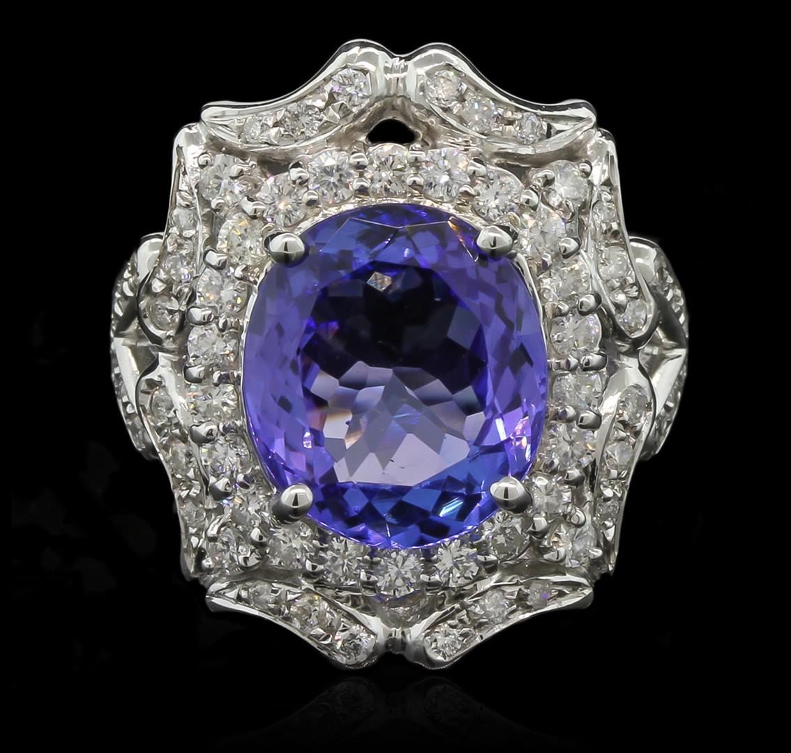 One electronically tested 14KT white gold lady's cast fashion ring with a split shank with a bright polish finish. The featured lady's ring has a 3.0 millimeter wide shank. Identified with markings of "K14". Condition is new, good workmanship. Containing: One prong set oval standard brilliant cut natural tanzanite, measuring 12.16 x 10.65 x 5.83mm, 10% bulge factor, approximate weight of 6.02ct., clarity is eye clean, type I, medium, very slightly grayish, violetish blue color, (GIA vB 5/3), cut is very good. Transmitting light somewhat diffusely, transparent to translucent. Colored gemstones are presumed to have been subjected to commonly used enhancement processes. Graded in the setting. Twenty-Two prong set round brilliant cut diamonds, measuring 1.80 - 1.75 x 1.16mm (depth est.) approximate total weight of 22 Stones = 0.52ct. Graded in the setting. Clarity: SI-1 to I-1. Color: H - I. Cut Good Thirty-Eight prong set round brilliant cut diamonds, measuring 1.30 - 1.25 x 0.83mm (depth est.) approximate total weight of 38 Stones = 0.32ct. Graded in the setting. Clarity: SI-1 to I-1. Color: H - I. Cut Good. Total Weight of Colored Stones 6.02ct. Total Weight of Diamonds 0.84ct. Total Weight of Ring 9.70gm. GAS Appraised at $11,595.00.