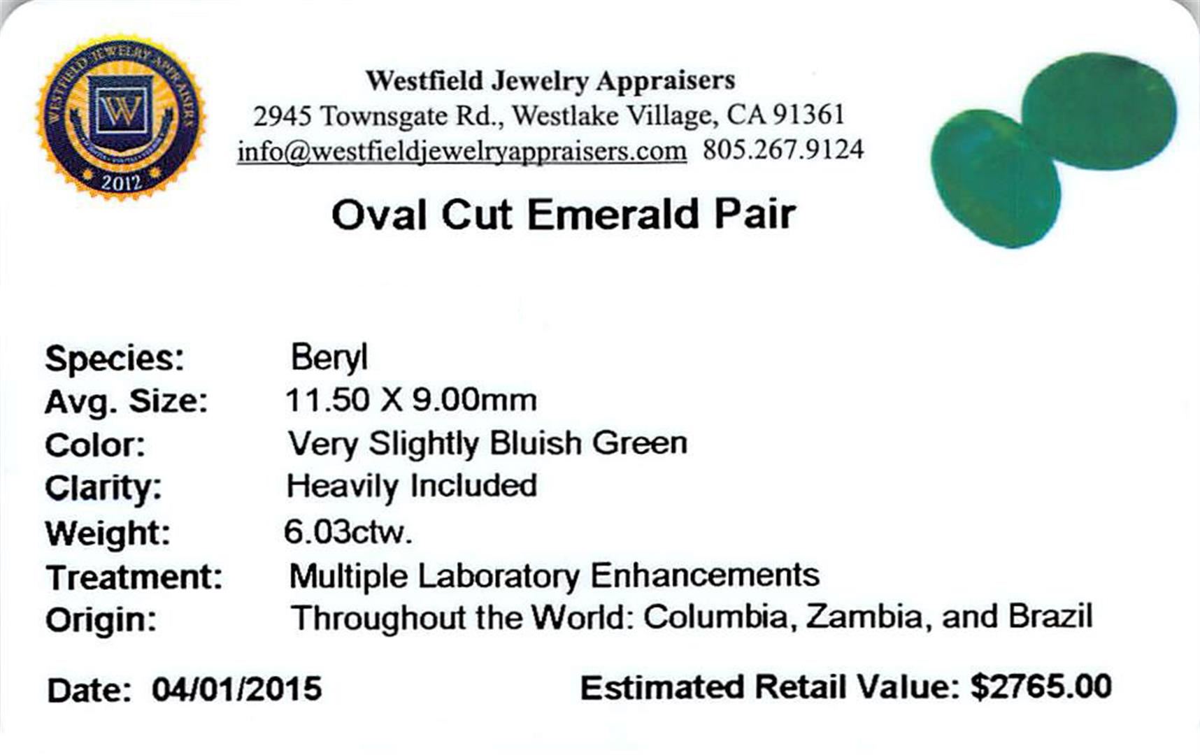 Two oval cut natural emeralds, measuring 11.50 x 9.00 x 4.30mm, exact total weight 6.03ct., clarity is heavily included, type III, medium dark, very slightly grayish, very slightly bluish green color, (GIA vslbG 6/3), cut is good. Indications of multiple laboratory enhancements, including high temperature heat treatment._x000D_ Westfield Appraised.