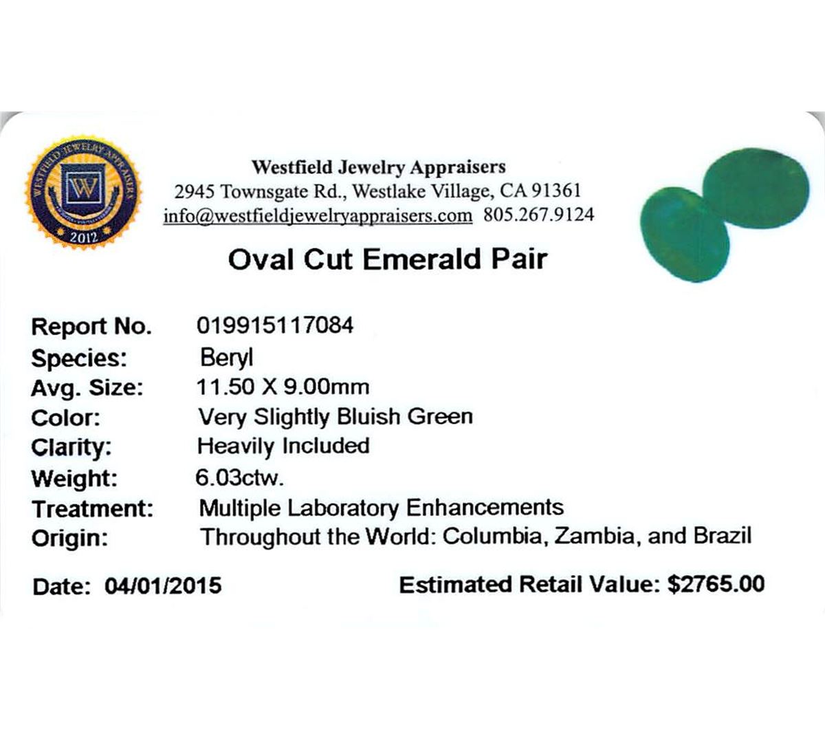 Two oval cut natural emeralds, measuring 11.50 x 9.00 x 4.30mm, exact total weight 6.03ct., clarity is heavily included, type III, medium dark, very slightly grayish, very slightly bluish green color, (GIA vslbG 6/3), cut is good. Indications of multiple laboratory enhancements, including high temperature heat treatment. Westfield Appraised at $2,765.00.