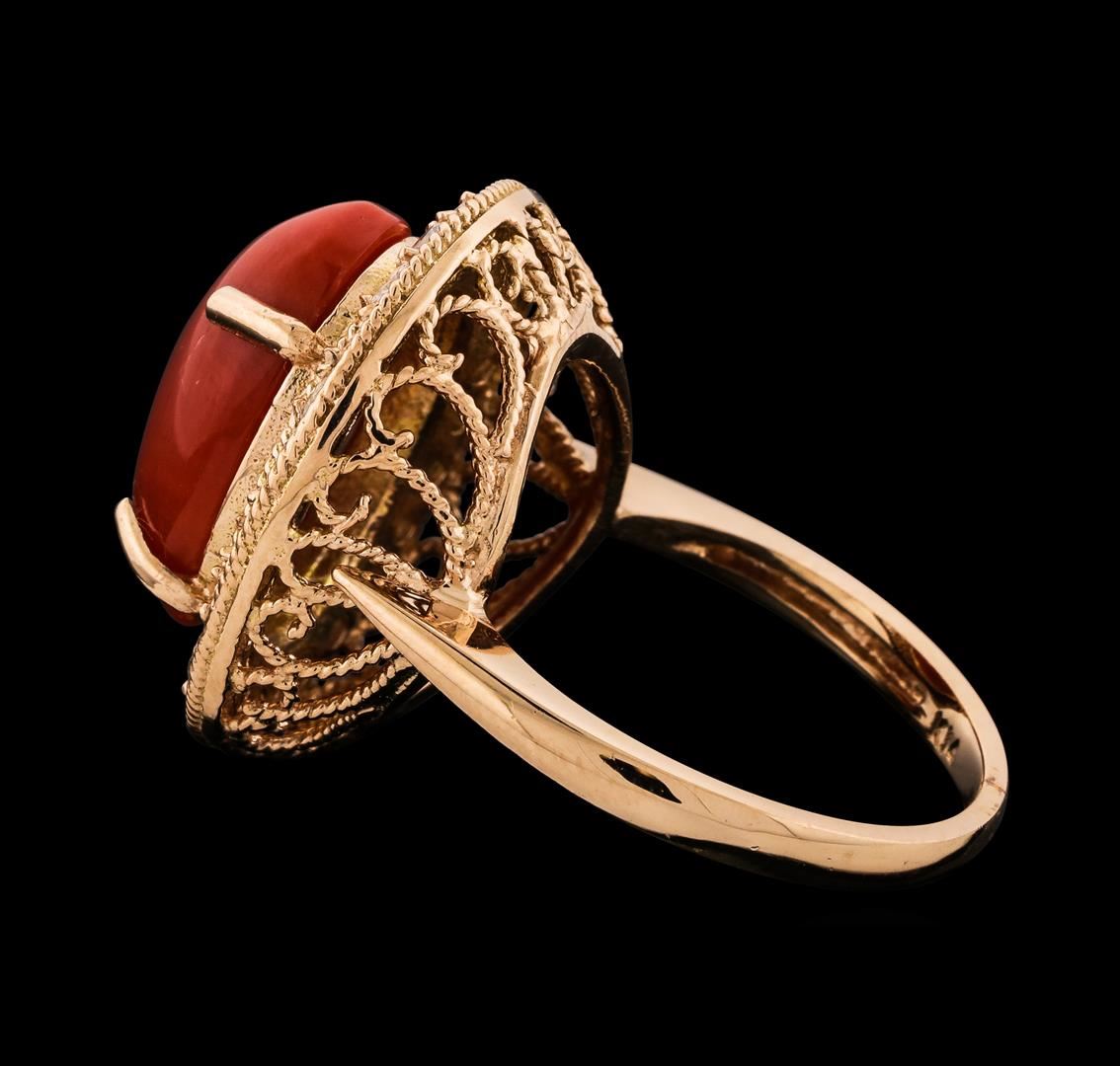 One electronically tested 14KT rose gold lady's cast fashion ring with a basket halo with a bright polish with milgrain detailing finish. The featured lady's ring has a shank measuring 1.95 millimeters wide. Identified with markings of 'K14'. Condition is new, good workmanship. Containing: One prong set oval cabochon standard cut natural red coral, measuring 15.35 x 11.03 x 4.92mm, (depth est.) approximate weight of 6.04ct., clarity is slightly included, medium, very slightly brownish, orangy red color, (GIA oR 5/3), cut is very good. Colored gemstones are presumed to have been subjected to commonly used enhancement processes. Graded in the setting. Twenty-Four prong set round brilliant cut diamonds, measuring 2.10 - 2.00 x 1.27mm (depth est.) approximate total weight of 24 Stones = 0.80ct. Graded in the setting. Clarity SI-1 to I-1. Color: G - H Cut Good. Total Weight of Colored Stones 6.04ct.. Total Weight of Diamonds 0.80ct.. Total Weight of Ring 8.00gm. GAS Appraised at $5,515.00.