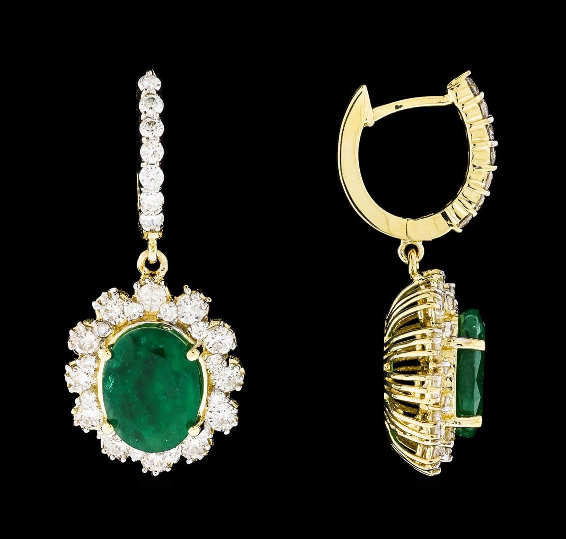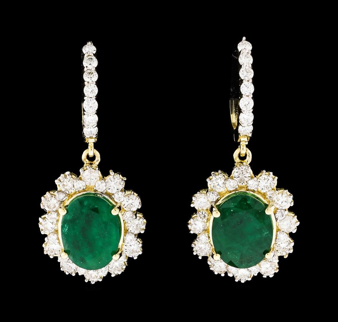 One pair electronically tested 14KT yellow gold lady's combination cast & assembled fashion dangle earrings with hinged, snap locking posts with a staggered double basket halo with a bright polish finish. The featured lady's earrings have a drop of approximately 34 millimeters. Identified with markings of '14K'. Condition is new, good workmanship. Containing: Two prong set oval modified mixed cut natural emeralds, measuring 11.21 x 8.50 x 4.72mm, (depth est.) 15%. bulge factor, approximate total weight of 6.04ct., clarity is heavily included, medium dark, moderately strong, green color, (GIA G 6/4), cut is good. Transmitting light somewhat diffusely, semi-transparent to translucent. Naturally occurring internal & external characteristics are present. Indications of oil residue. Colored gemstones are presumed to have been subjected to commonly used enhancement processes. Graded in the setting. Twenty-Four prong set round brilliant cut diamonds, measuring 2.60 - 2.50 x 1.53mm (depth est.) approximate total weight of 24 Stones = 1.46ct. Graded in the setting. Clarity SI-1 to SI-2. Color: H - I Cut Good Fourteen prong set round brilliant cut diamonds, measuring 2.10 - 2.00 x 1.25mm (depth est.) approximate total weight of 14 Stones = 0.45ct. Graded in the setting. Clarity SI-1 to SI-2. Color: G - H Cut Good Twenty-Four prong set round brilliant cut diamonds, measuring 1.60 - 1.50 x 0.96mm (depth est.) approximate total weight of 24 Stones = 0.34ct. Graded in the setting. Clarity SI-1 to SI-2. Color: G - H Cut Good. Total Weight of Colored Stones 6.04ct.. Total Weight of Diamonds 2.25ct.. Total Weight of Earrings 9.00gm. GAS Appraised at $10,625.00.
