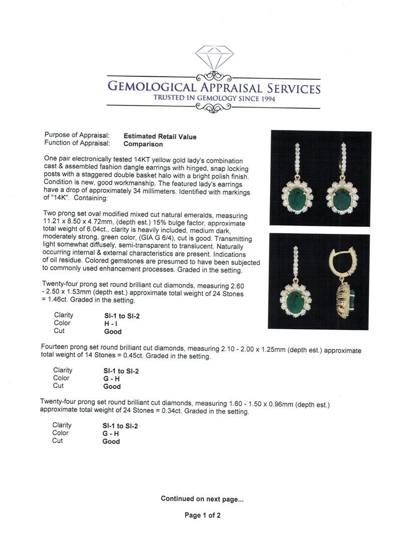 One pair electronically tested 14KT yellow gold lady's combination cast & assembled fashion dangle earrings with hinged, snap locking posts with a staggered double basket halo with a bright polish finish. The featured lady's earrings have a drop of approximately 34 millimeters. Identified with markings of '14K'. Condition is new, good workmanship. Containing: Two prong set oval modified mixed cut natural emeralds, measuring 11.21 x 8.50 x 4.72mm, (depth est.) 15%. bulge factor, approximate total weight of 6.04ct., clarity is heavily included, medium dark, moderately strong, green color, (GIA G 6/4), cut is good. Transmitting light somewhat diffusely, semi-transparent to translucent. Naturally occurring internal & external characteristics are present. Indications of oil residue. Colored gemstones are presumed to have been subjected to commonly used enhancement processes. Graded in the setting. Twenty-Four prong set round brilliant cut diamonds, measuring 2.60 - 2.50 x 1.53mm (depth est.) approximate total weight of 24 Stones = 1.46ct. Graded in the setting. Clarity SI-1 to SI-2. Color: H - I Cut Good Fourteen prong set round brilliant cut diamonds, measuring 2.10 - 2.00 x 1.25mm (depth est.) approximate total weight of 14 Stones = 0.45ct. Graded in the setting. Clarity SI-1 to SI-2. Color: G - H Cut Good Twenty-Four prong set round brilliant cut diamonds, measuring 1.60 - 1.50 x 0.96mm (depth est.) approximate total weight of 24 Stones = 0.34ct. Graded in the setting. Clarity SI-1 to SI-2. Color: G - H Cut Good. Total Weight of Colored Stones 6.04ct.. Total Weight of Diamonds 2.25ct.. Total Weight of Earrings 9.00gm. GAS Appraised at $10,625.00.