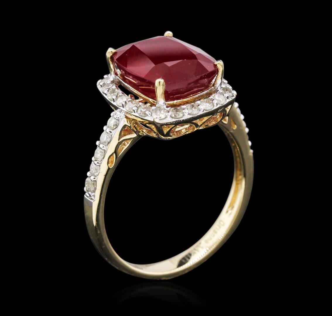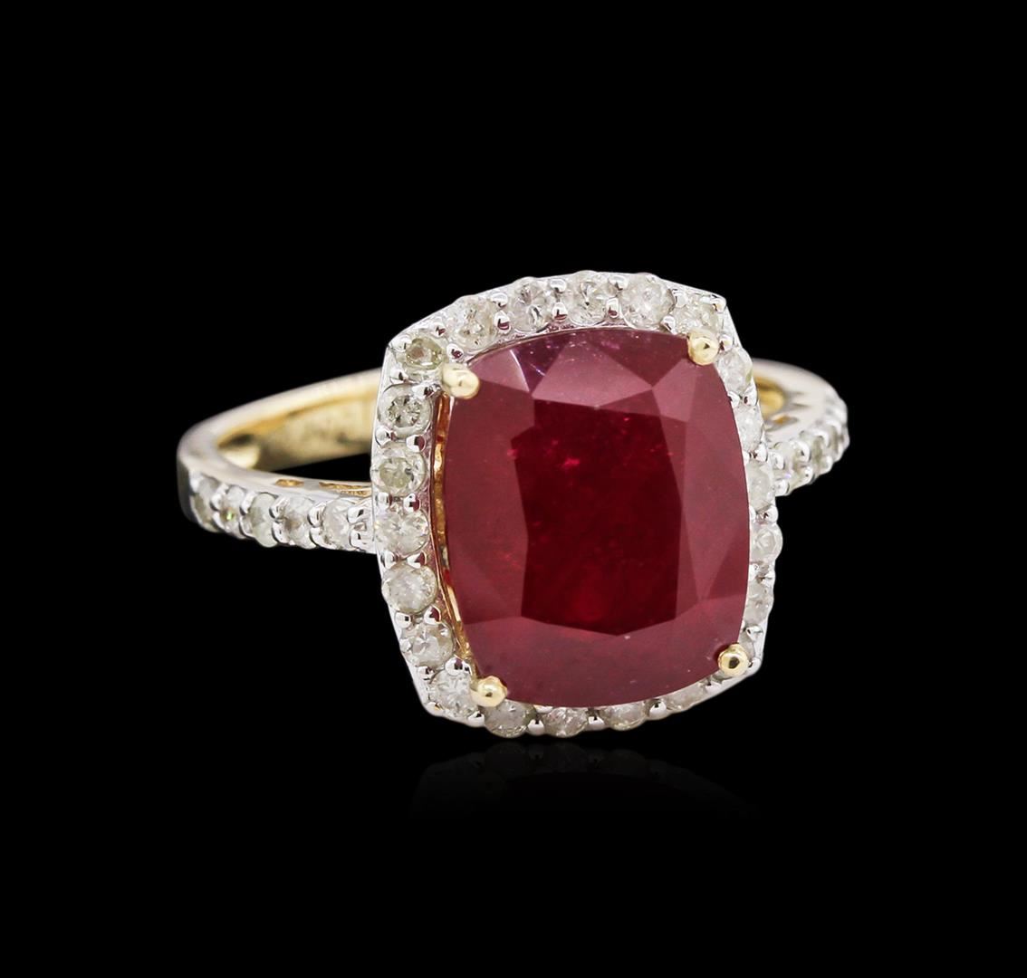 Fourteen karat (14K) yellow gold ruby and diamond ring. A radiant cut ruby corundum gemstone is prong mounted in the center of the ring. Round brilliant cut diamonds accent the ring around the center gemstone and on both sides. The ring is cast stamped "14K" and has a gross weight of 4.4 Grams. Diamond(s): Shape: Round Brilliant Cut. Weight: 0.57 carat. Average Clarity: I1-I2. Average Color: H-J. Symmetry: Very Good. Polish: Very Good. GemStone(s): Ruby Corundum. Nature: Natural. Shape: Radiant, Faceted. Quantity: 1, Mounted. Weight: 6.04 carat. Dimensions: Length- 11.08 mm. ; Width 9.03 mm. Bulge: Visible. Clarity: I1, Type 3. Color: Red (5/5). Symmetry: Very Good. Color Intensity: Medium. Transparency: Transparent. Tone: Dark. Enhancements: Indications of high temperature heat treatment, with glass and flux additives. Metal(s): Metal: Gold, Stamped. Purity: 14K. Color: Yellow. Condition: Excellent. Finish: High polish. GGA Appraised at $3,280.00.