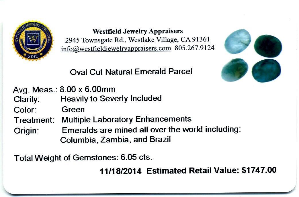 6.05cts. Oval Cut Natural Emerald Parcel Westfield Appraised at $1,747.00.