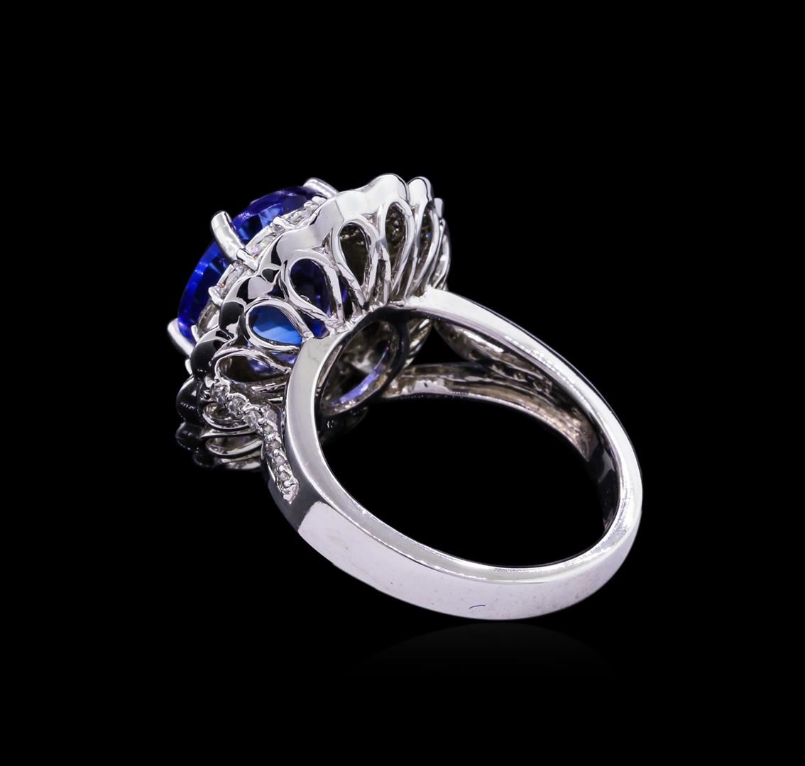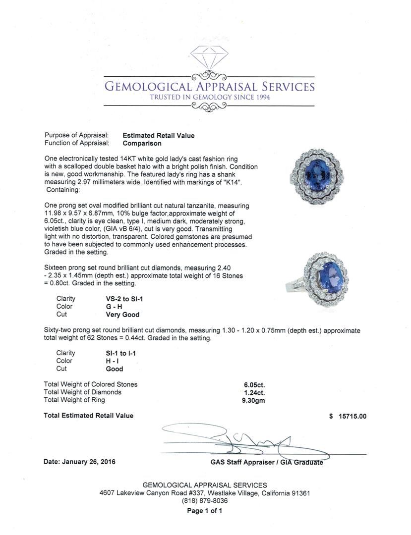 One electronically tested 14KT white gold lady's cast fashion ring with a scalloped double basket halo with a bright polish finish. The featured lady's ring has a shank measuring 2.97 millimeters wide. Identified with markings of "K14". Condition is new, good workmanship. Containing: One prong set oval modified brilliant cut natural tanzanite, measuring 11.98 x 9.57 x 6.87mm, 10%. bulge factor, approximate weight of 6.05ct., clarity is eye clean, type I, medium dark, moderately strong, violetish blue color, (GIA vB 6/4), cut is very good. Transmitting light with no distortion, transparent. Colored gemstones are presumed to have been subjected to commonly used enhancement processes. Graded in the setting. Sixteen prong set round brilliant cut diamonds, measuring 2.40 - 2.35 x 1.45mm (depth est.) approximate total weight of 16 Stones = 0.80ct. Graded in the setting. Clarity: VS-2 to SI-1. Color: G - H. Cut Very Good Sixty-Two prong set round brilliant cut diamonds, measuring 1.30 - 1.20 x 0.75mm (depth est.) approximate total weight of 62 Stones = 0.44ct. Graded in the setting. Clarity: SI-1 to I-1. Color: H - I. Cut Good. Total Weight of Colored Stones 6.05ct. Total Weight of Diamonds 1.24ct. Total Weight of Ring 9.30gm. GAS Appraised at $15,715.00.