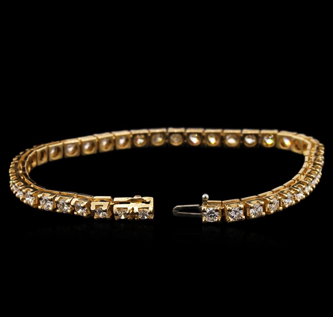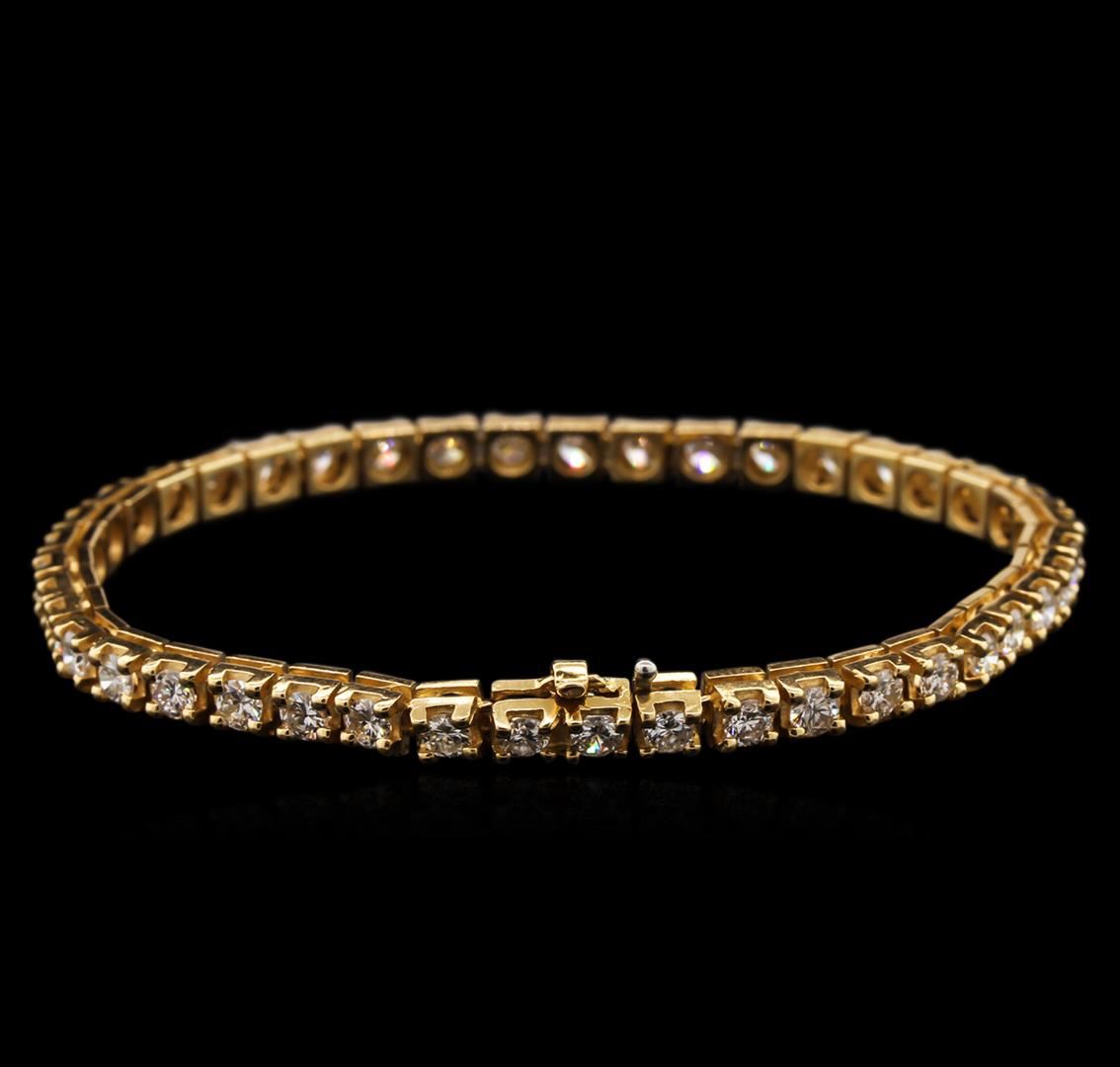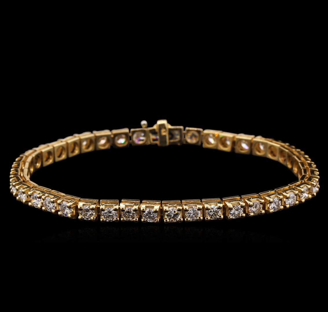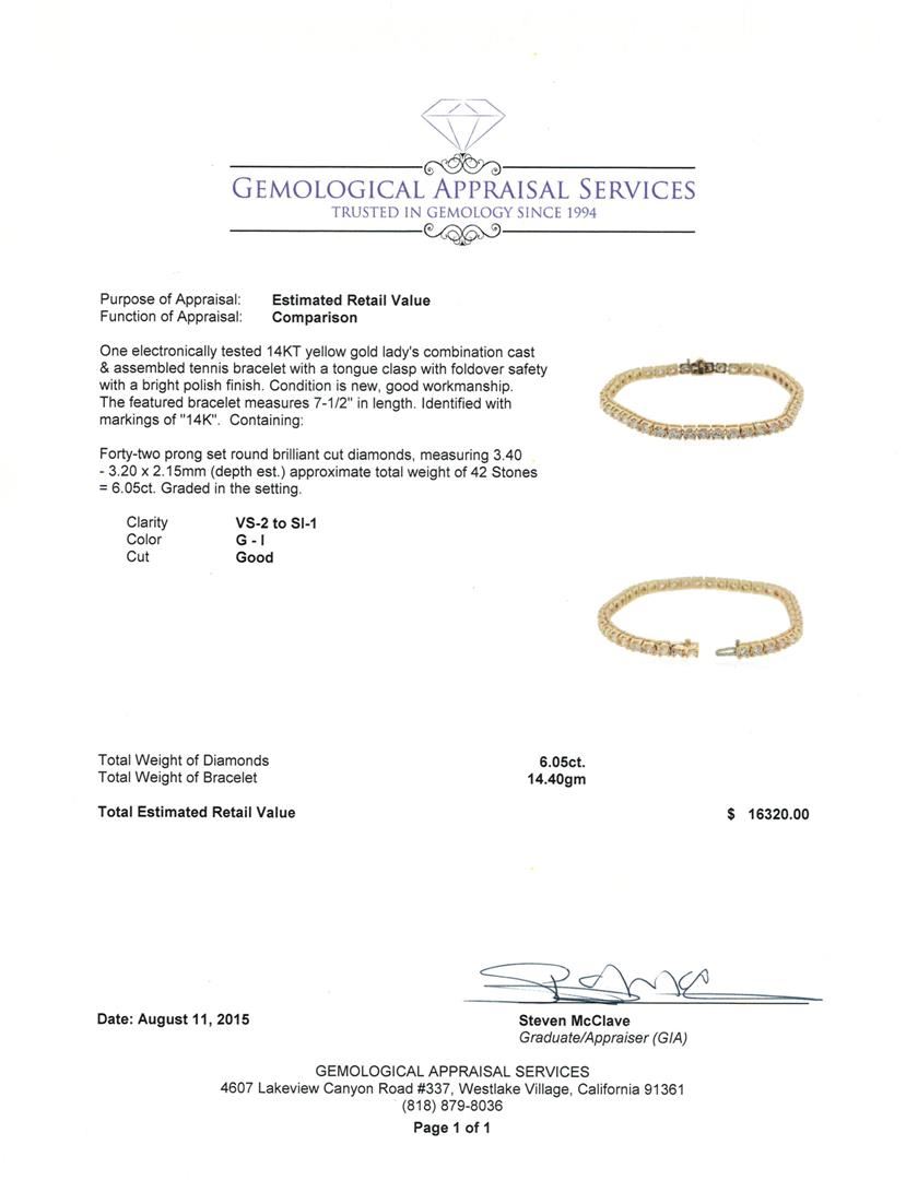 One electronically tested 14KT yellow gold lady's combination cast & assembled tennis bracelet with a tongue clasp with foldover safety with a bright polish finish. The featured bracelet measures 7-1/2" in length. Identified with markings of "14K". Condition is new, good workmanship. Containing: Forty-Two prong set round brilliant cut diamonds, measuring 3.40 - 3.20 x 2.15mm (depth est.) approximate. Total Weight of 42 Stones = 6.05ct. Graded in the setting. Clarity: VS-2 to SI-1. Color: G - I. Cut Good. Total Weight of Diamonds 6.05ct. Total Weight of Bracelet 14.40gm. GAS Appraised at $16,320.00.