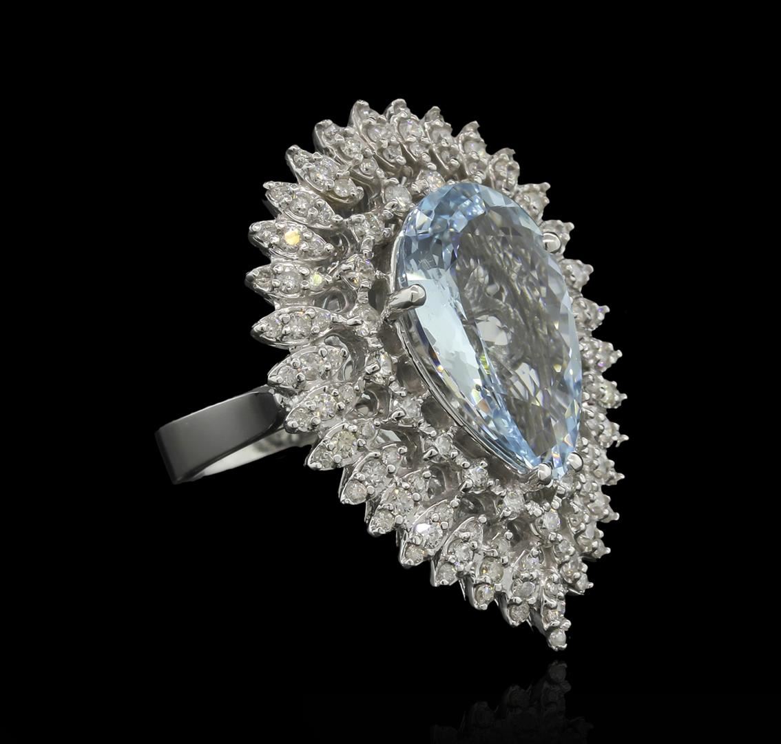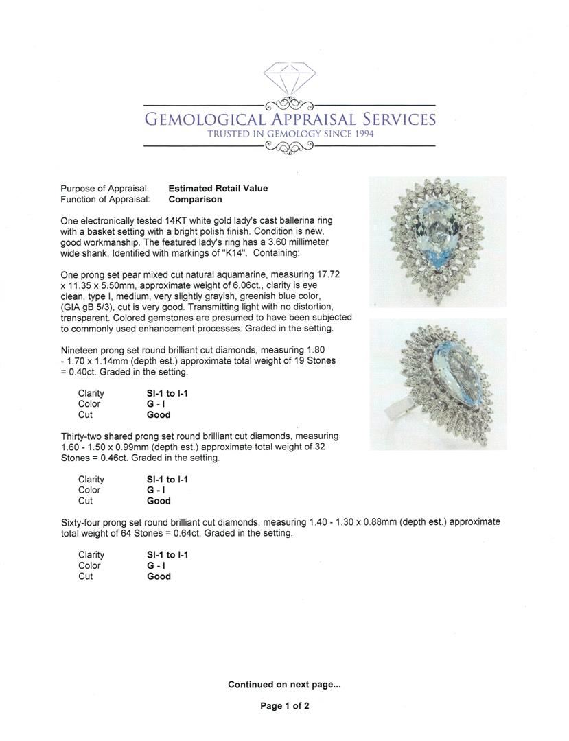 One electronically tested 14KT white gold lady's cast ballerina ring with a basket setting with a bright polish finish. The featured lady's ring has a 3.60 millimeter wide shank. Identified with markings of "K14". Condition is new, good workmanship. Containing: One prong set pear mixed cut natural aquamarine, measuring 17.72 x 11.35 x 5.50mm, approximate weight of 6.06ct., clarity is eye clean, type I, medium, very slightly grayish, greenish blue color, (GIA gB 5/3), cut is very good. Transmitting light with no distortion, transparent. Colored gemstones are presumed to have been subjected to commonly used enhancement processes. Graded in the setting. Nineteen prong set round brilliant cut diamonds, measuring 1.80 - 1.70 x 1.14mm (depth est.) approximate total weight of 19 Stones = 0.40ct. Graded in the setting. Clarity: SI-1 to I-1. Color: G - I. Cut Good Thirty-Two shared prong set round brilliant cut diamonds, measuring 1.60 - 1.50 x 0.99mm (depth est.) approximate total weight of 32 Stones = 0.46ct. Graded in the setting. Clarity: SI-1 to I-1. Color: G - I. Cut Good Sixty-Four prong set round brilliant cut diamonds, measuring 1.40 - 1.30 x 0.88mm (depth est.) approximate total weight of 64 Stones = 0.64ct. Graded in the setting. Clarity: SI-1 to I-1. Color: G - I. Cut Good. Total Weight of Colored Stones 6.06ct. Total Weight of Diamonds 1.50ct. Total Weight of Ring 12.80gm. GAS Appraised at $12,605.00.