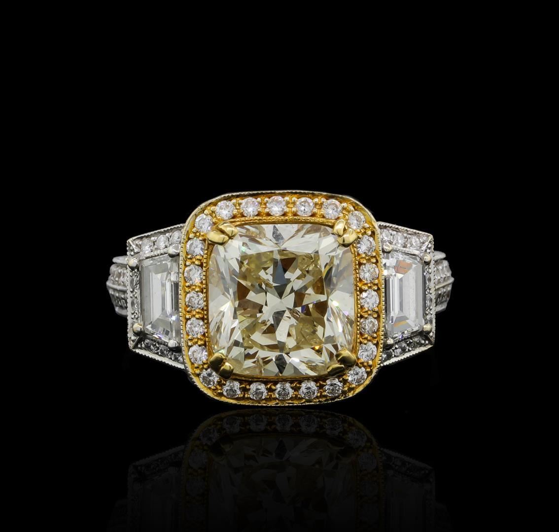 One electronically tested 18KT white and yellow gold lady's combination cast & assembled wedding ring with a cathedral three stone triple halo with a bright polish with milgrain detailing finish. The featured lady's ring has an inlaid filigree under gallery and a shank measuring 2.66 millimeters wide. Identified with markings of '18K'. Condition is new, good workmanship. Containing: One prong set cushion cut diamond, measuring 8.95 x 8.54 x 5.50mm (depth est.) , 5.00.%. GTCF approximate weight of 3.78ct. Graded in the setting. Clarity SI-2 Cut Very Good Two prong set step trapezoid cut diamonds, measuring 5.00 x 3.30 x 2.10mm (depth est.) approximate total weight of 2 Stones = 0.78ct. Graded in the setting. Clarity VS-1 to VS-2. Color: G - H Cut Very Good Two Hundred Eighteen prong set round brilliant cut diamonds, measuring 1.30 - 1.10 x 0.74mm (depth est.) approximate total weight of 218 Stones = 1.50 ct. Graded in the setting. Clarity VS-1 to VS-2. Color: G - H Cut Very Good. Total Weight of Diamonds 6.06ct.. Total Weight of Ring 8.60gm. GAS Appraised.