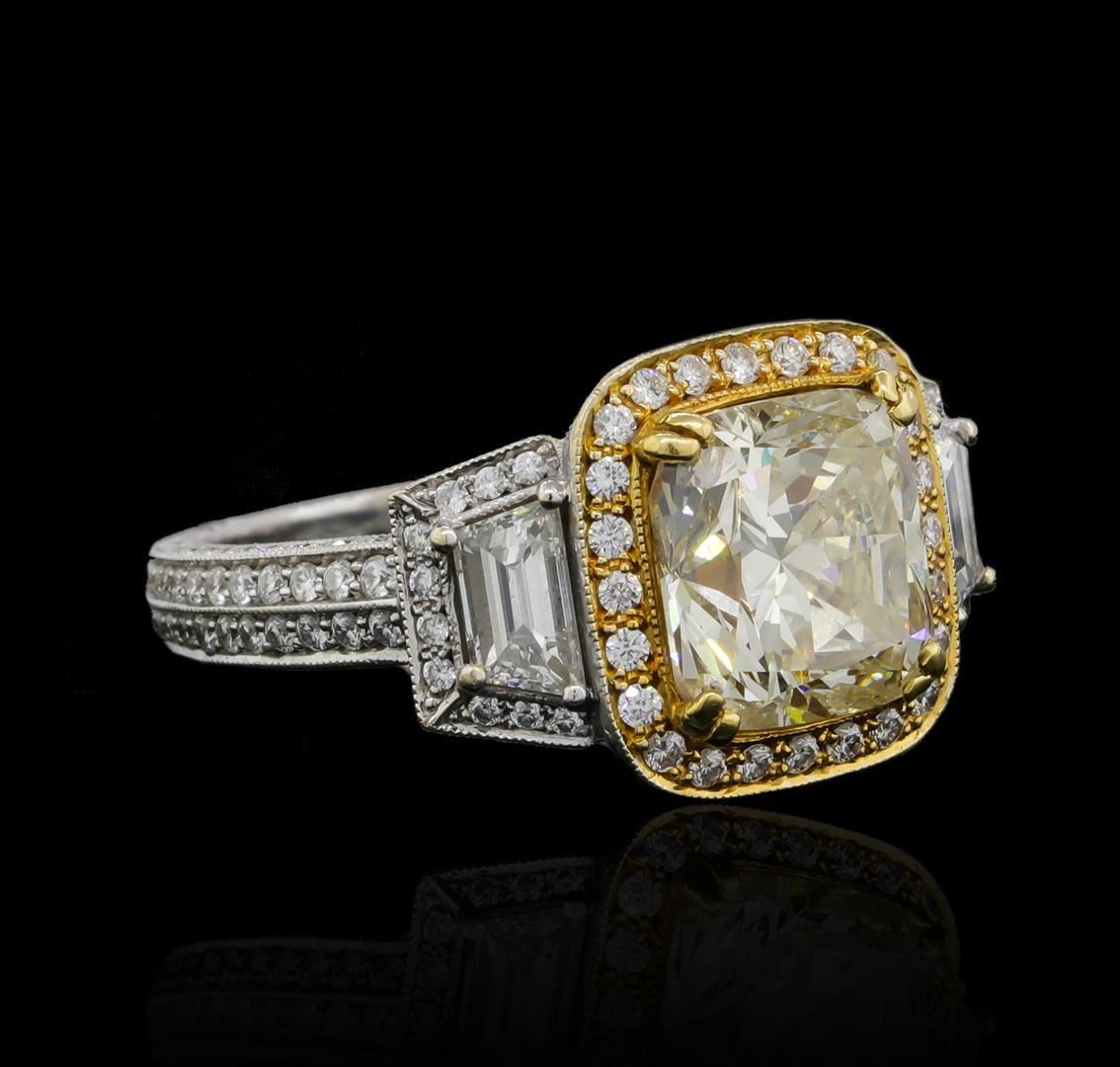 One electronically tested 18KT white and yellow gold lady's combination cast & assembled wedding ring with a cathedral three stone triple halo with a bright polish with milgrain detailing finish. The featured lady's ring has an inlaid filigree under gallery and a shank measuring 2.66 millimeters wide. Identified with markings of '18K'. Condition is new, good workmanship. Containing: One prong set cushion cut diamond, measuring 8.95 x 8.54 x 5.50mm (depth est.), 5.00.%. GTCF approximate weight of 3.78ct. Graded in the setting. Clarity SI-2 Cut Very Good Two prong set step trapezoid cut diamonds, measuring 5.00 x 3.30 x 2.10mm (depth est.) approximate total weight of 2 Stones = 0.78ct. Graded in the setting. Clarity VS-1 to VS-2. Color: G - H Cut Very Good Two Hundred Eighteen prong set round brilliant cut diamonds, measuring 1.30 - 1.10 x 0.74mm (depth est.) approximate total weight of 218 Stones = 1.50 ct. Graded in the setting. Clarity VS-1 to VS-2. Color: G - H Cut Very Good. Total Weight of Diamonds 6.06ct.. Total Weight of Ring 8.60gm. GAS Appraised.
