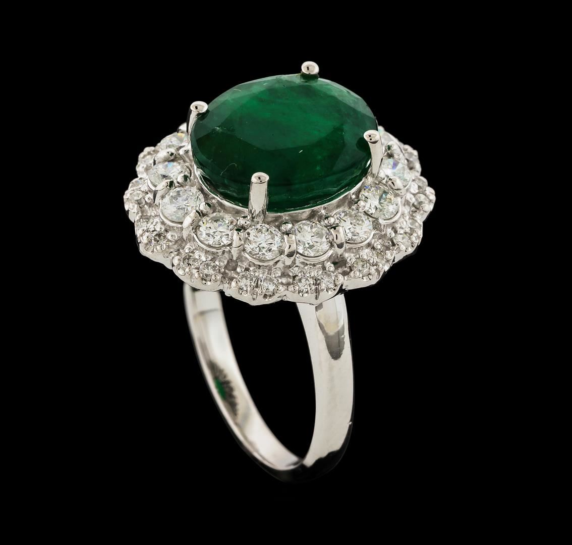 One electronically tested 14KT white gold lady's cast fashion ring with a scalloped double basket halo with a bright polish finish. The featured lady's ring has a shank measuring 2.21 millimeters wide. Identified with markings of 'K14'. Condition is new, good workmanship. Containing: One prong set oval modified brilliant cut natural emerald, measuring 12.63 x 10.12 x 7.27mm, (depth est.) 14%. bulge factor, approximate weight of 6.06ct., clarity is heavily included, medium dark, moderately strong, green color, (GIA G 6/4), cut is good. Transmitting light somewhat diffusely, semi-transparent to translucent. Naturally occurring internal & external characteristics are present. Indications of oil residue. Colored gemstones are presumed to have been subjected to commonly used enhancement processes. Graded in the setting. Fourteen prong set round brilliant cut diamonds, measuring 2.75 - 2.65 x 1.67mm (depth est.) approximate total weight of 14 Stones = 1.05ct. Graded in the setting. Clarity SI-1 to I-1. Color: G - H Cut Good Twenty-Eight prong set round brilliant cut diamonds, measuring 1.40 - 1.35 x 0.86mm (depth est.) approximate total weight of 28 Stones = 0.28ct. Graded in the setting. Clarity SI-1 to SI-2. Color: G - H Cut Good. Total Weight of Colored Stones 6.06ct.. Total Weight of Diamonds 1.33ct.. Total Weight of Ring 8.00gm GAS Appraised at $9,250.00.