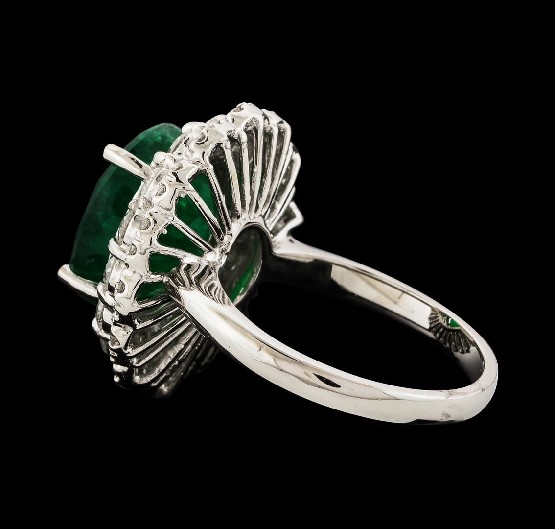 One electronically tested 14KT white gold lady's cast fashion ring with a scalloped double basket halo with a bright polish finish. The featured lady's ring has a shank measuring 2.21 millimeters wide. Identified with markings of 'K14'. Condition is new, good workmanship. Containing: One prong set oval modified brilliant cut natural emerald, measuring 12.63 x 10.12 x 7.27mm, (depth est.) 14%. bulge factor, approximate weight of 6.06ct., clarity is heavily included, medium dark, moderately strong, green color, (GIA G 6/4), cut is good. Transmitting light somewhat diffusely, semi-transparent to translucent. Naturally occurring internal & external characteristics are present. Indications of oil residue. Colored gemstones are presumed to have been subjected to commonly used enhancement processes. Graded in the setting. Fourteen prong set round brilliant cut diamonds, measuring 2.75 - 2.65 x 1.67mm (depth est.) approximate total weight of 14 Stones = 1.05ct. Graded in the setting. Clarity SI-1 to I-1. Color: G - H Cut Good Twenty-Eight prong set round brilliant cut diamonds, measuring 1.40 - 1.35 x 0.86mm (depth est.) approximate total weight of 28 Stones = 0.28ct. Graded in the setting. Clarity SI-1 to SI-2. Color: G - H Cut Good. Total Weight of Colored Stones 6.06ct.. Total Weight of Diamonds 1.33ct.. Total Weight of Ring 8.00gm GAS Appraised at $9,250.00.