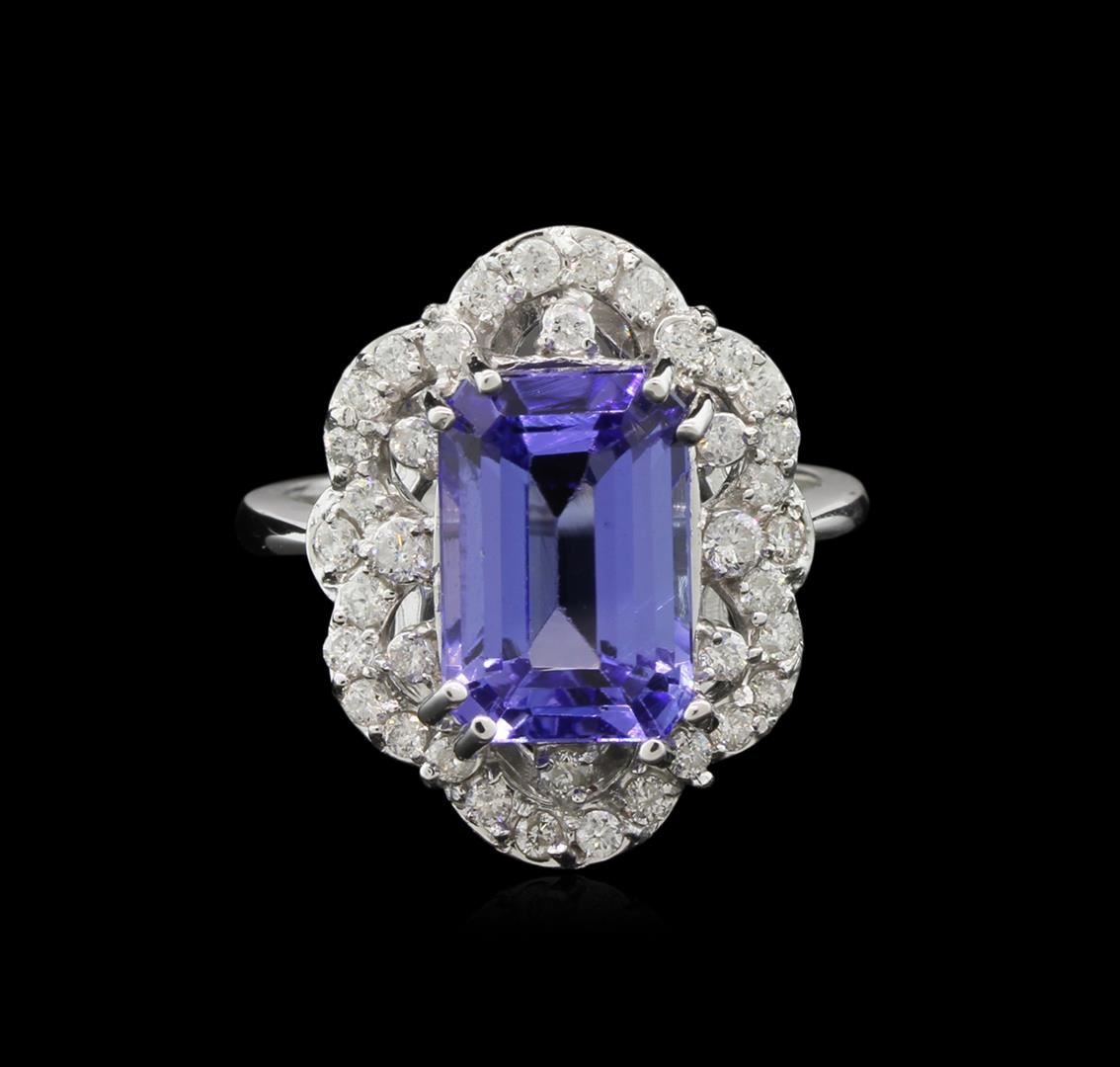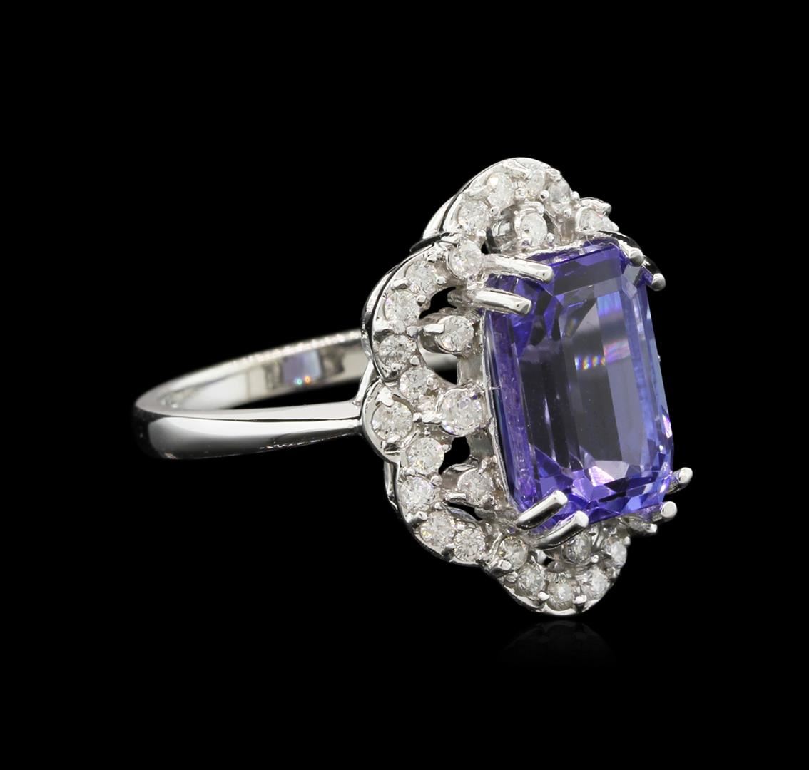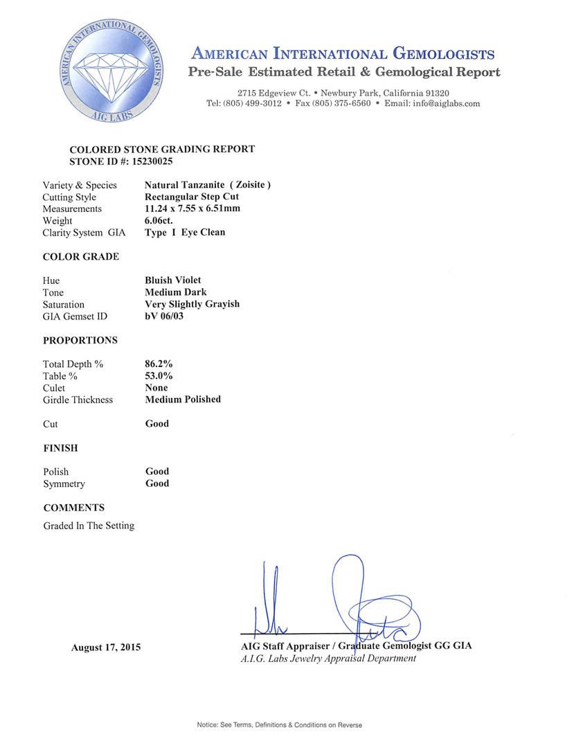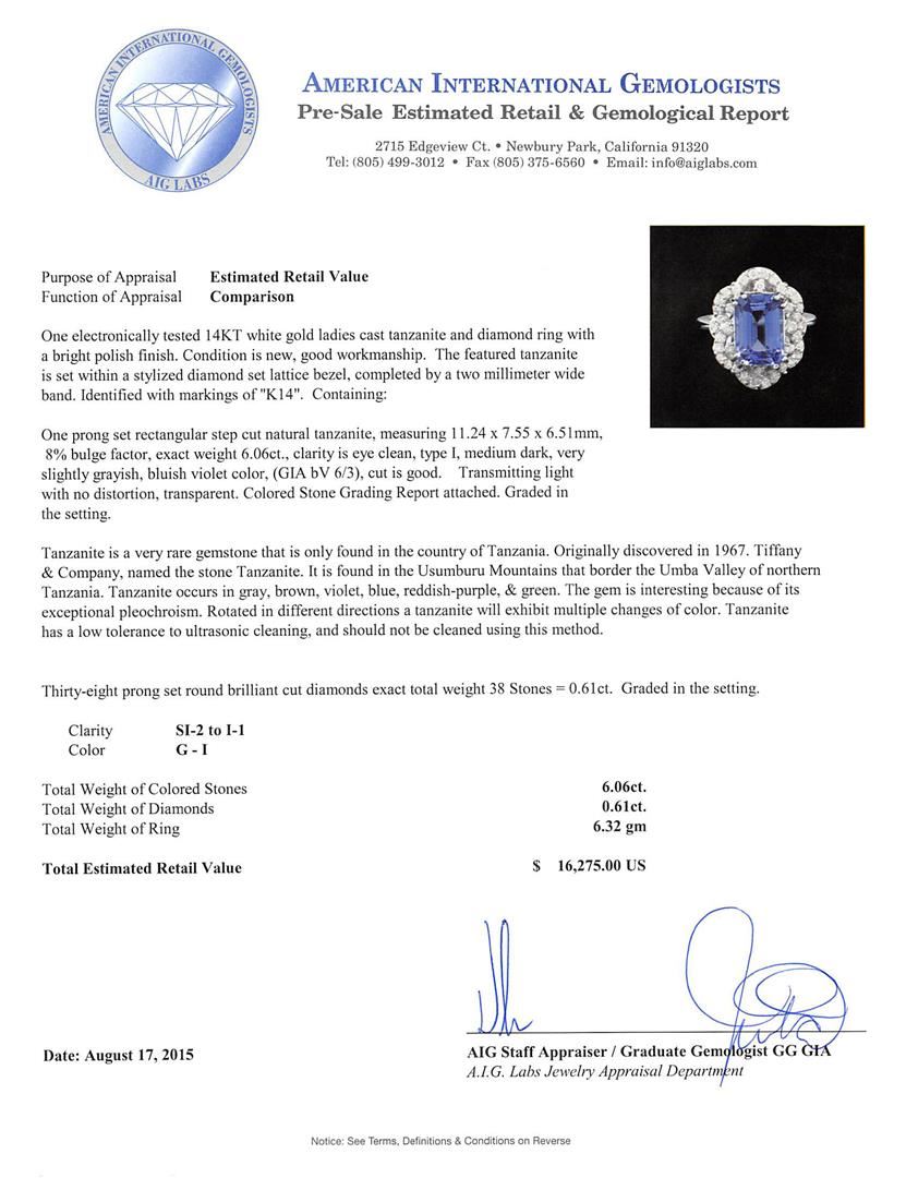 One electronically tested 14KT white gold ladies cast tanzanite and diamond ring with a bright polish finish. The featured tanzanite is set within a stylized diamond set lattice bezel, completed by a two millimeter wide band. Identified with markings of "K14". Condition is new, good workmanship. Containing: One prong set rectangular step cut natural tanzanite, measuring 11.24 x 7.55 x 6.51mm, 8% bulge factor, exact weight 6.06ct., clarity is eye clean, type I, medium dark, very slightly grayish, bluish violet color, (GIA bV 6/3), cut is good. Transmitting light with no distortion, transparent. Colored Stone Grading Report attached. Graded in the setting. Tanzanite is a very rare gemstone that is only found in the country of Tanzania. Originally discovered in 1967. Tiffany & Company, named the stone Tanzanite. It is found in the Usumburu Mountains that border the Umba Valley of northern Tanzania. Tanzanite occurs in gray, brown, violet, blue, reddish-purple, & green. The gem is interesting because of its exceptional pleochroism. Rotated in different directions a tanzanite will exhibit multiple changes of color. Tanzanite has a low tolerance to ultrasonic cleaning, and should not be cleaned using this method. Thirty-Eight prong set round brilliant cut diamonds exact total weight 38 Stones = 0.61ct. Graded in the setting. Clarity: SI-2 to I-1. Color: G - I. Total Weight of Colored Stones 6.06ct. Total Weight of Diamonds 0.61ct. Total Weight of Ring 6.32gm. AIG Appraised at $16,275.00.