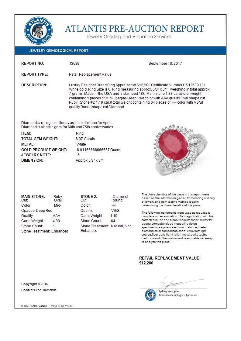 13639 - REF-158M2F ---- 6.07 CTW Ruby & Diamond Ring 18K White Gold ---- Luxury Designer Brand Ring Appraised at $12,200 Certificate Number US13639 18k White gold, Ring Size is 6, Ring measuring approx. 5/8" x 3/4 , weighing in total approx. 7 grams. Made in the USA and is stamped 18k, Main stone 4.88 carat total weight containing 1 pieces of Mid-Opaque-Deep Red color with AAA quality Oval shape cut Ruby , Stone #2 1.19 carat total weight containing 64 pieces of H-I color with VS/SI quality Round shape cut Diamond