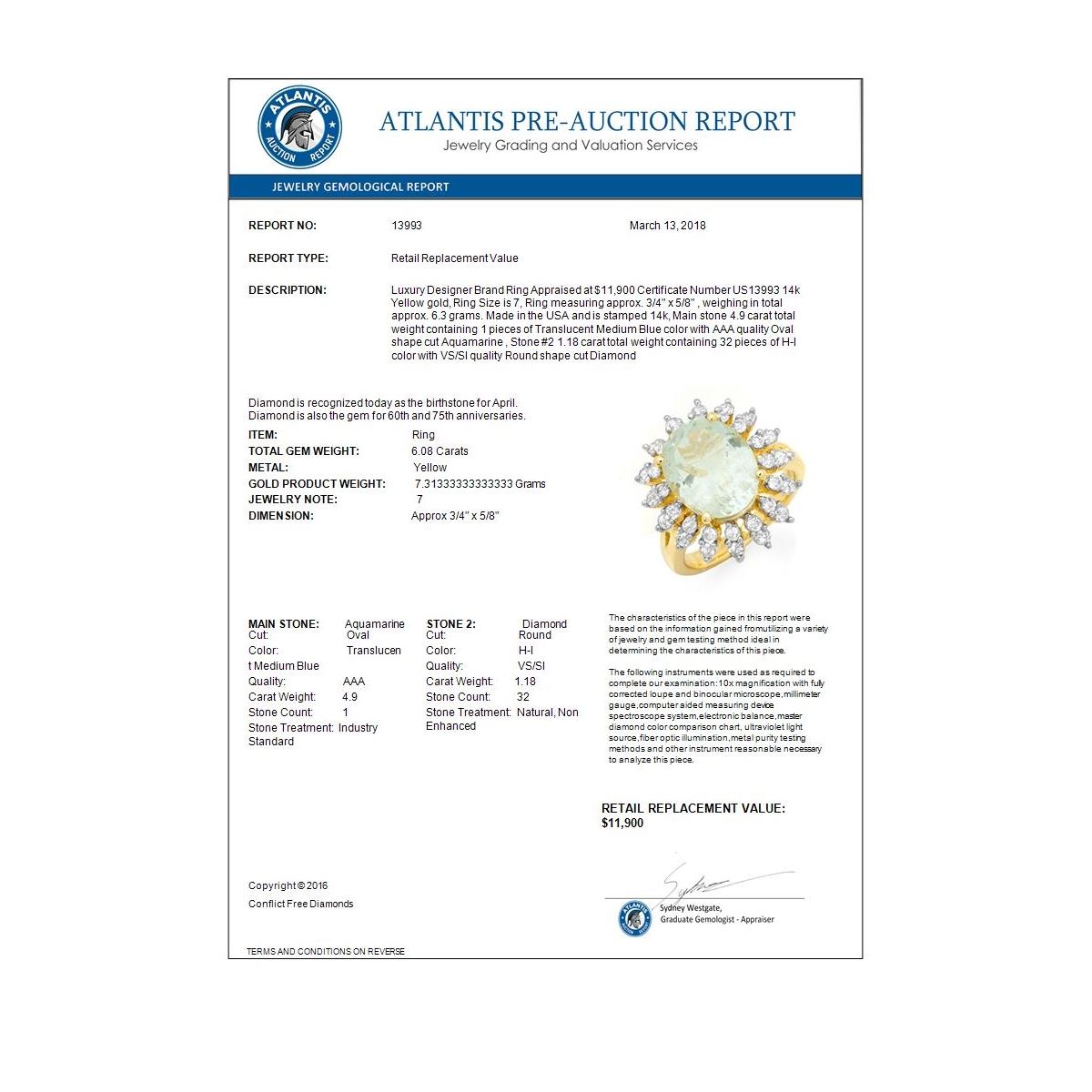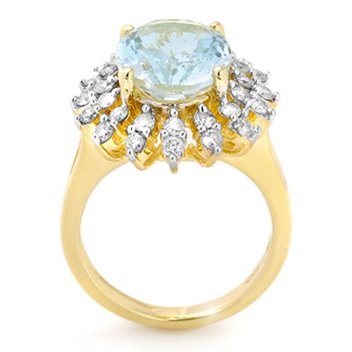 REF-166X2T -13993 ---- 6.08 CTW Aquamarine & Diamond Ring 14K Yellow Gold ---- Luxury Designer Brand Ring Appraised at $11,900 Certificate Number US13993 14k Yellow gold, Ring Size is 7, Ring measuring approx. 3/4" x 5/8" , weighing in total approx. 6.3 grams. Made in the USA and is stamped 14k, Main stone 4.9 carat total weight containing 1 pieces of Translucent Medium Blue color with AAA quality Oval shape cut Aquamarine , Stone #2 1.18 carat total weight containing 32 pieces of H-I color with VS/SI quality Round shape cut Diamond
