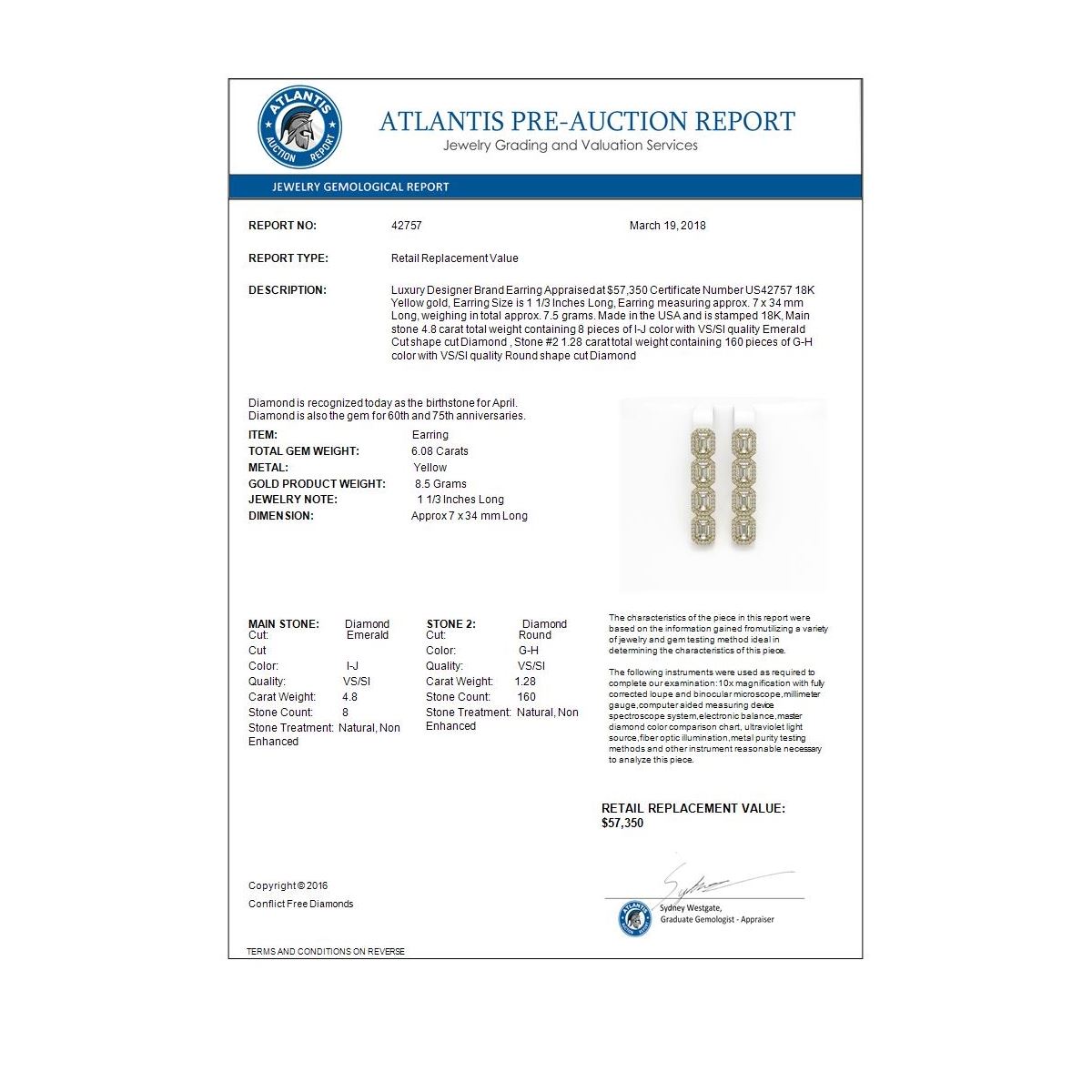 REF-1302M9H -42757 ---- 6.08 CTW Emerald Cut Diamond Designer Earrings 18K Yellow Gold ---- Luxury Designer Brand Earring Appraised at $57,350 Certificate Number US42757 18K Yellow gold, Earring Size is 1 1/3 Inches Long, Earring measuring approx. 7 x 34 mm Long, weighing in total approx. 7.5 grams. Made in the USA and is stamped 18K, Main stone 4.8 carat total weight containing 8 pieces of I-J color with VS/SI quality Emerald Cut shape cut Diamond , Stone #2 1.28 carat total weight containing 160 pieces of G-H color with VS/SI quality Round shape cut Diamond