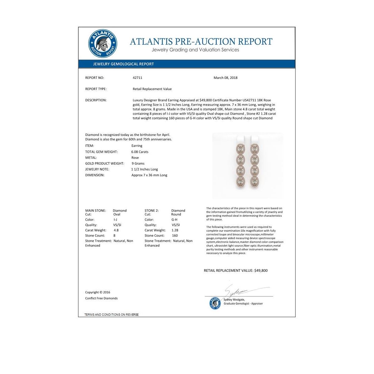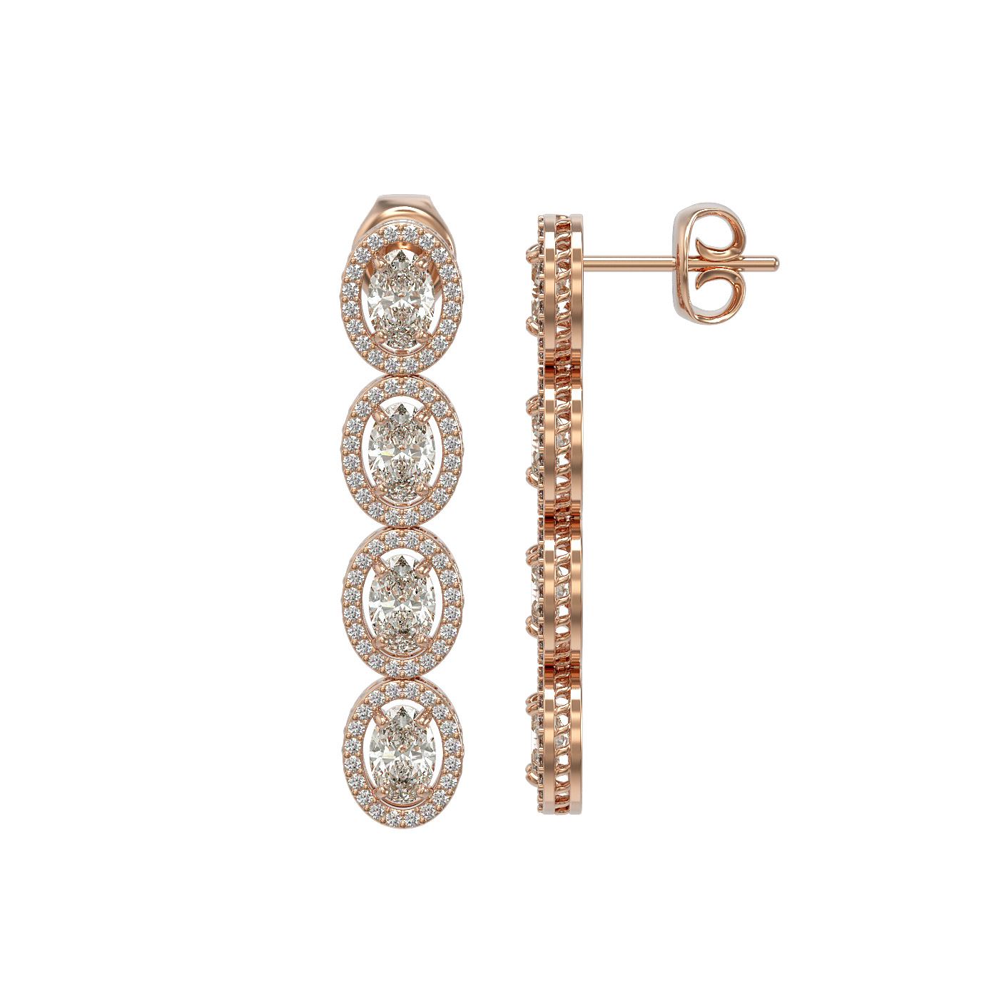 REF-1132T4M -42711 ---- 6.08 CTW Oval Diamond Designer Earrings 18K Rose Gold ---- Luxury Designer Brand Earring Appraised at $49,800 Certificate Number US42711  18K Rose gold,  Earring Size is 1 1/2 Inches Long, Earring measuring approx. 7 x 36 mm Long, weighing in total approx. 8 grams. Made in the USA and is stamped 18K, Main stone 4.8 carat total weight containing 8 pieces of I-J color with VS/SI quality Oval shape cut Diamond , Stone #2 1.28 carat total weight containing 160 pieces of G-H color with  VS/SI quality Round shape cut Diamond