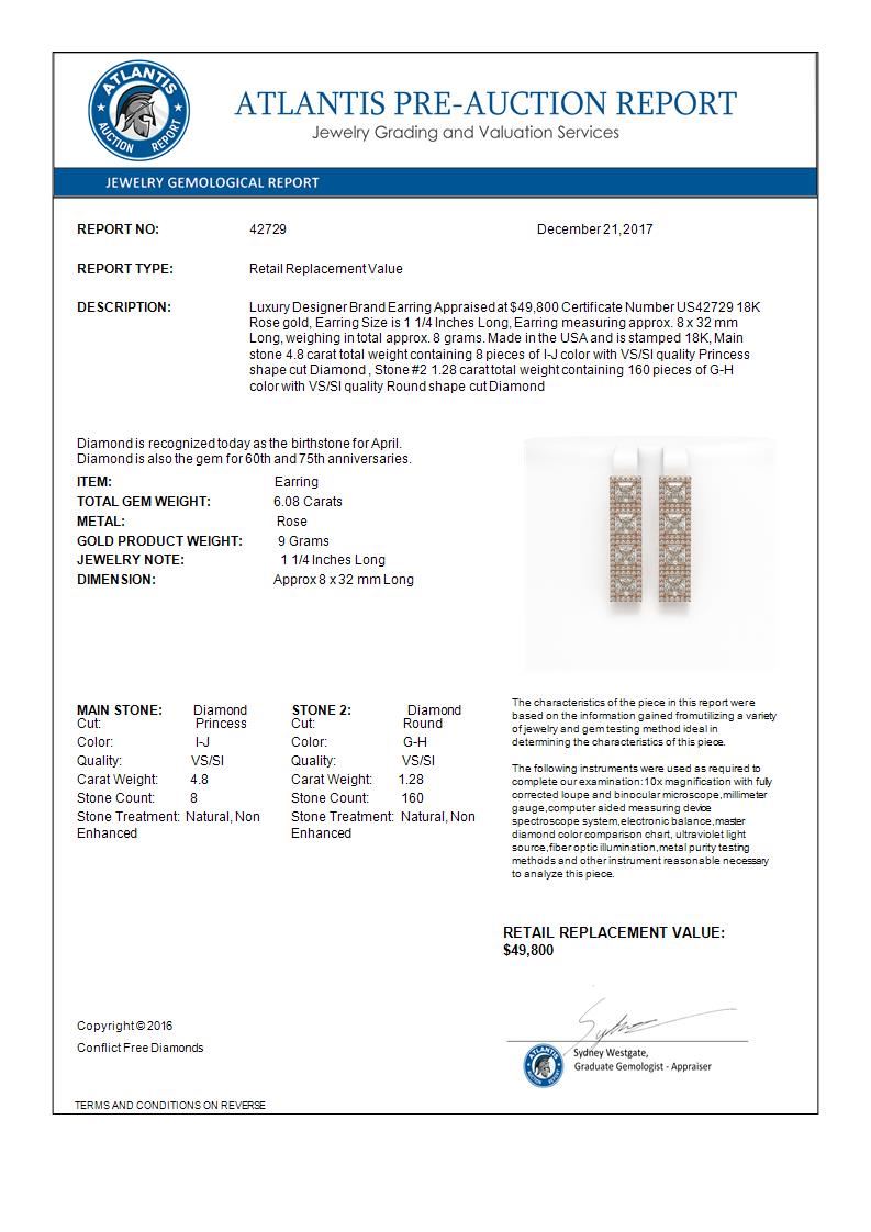 REF-1132X4T -42729 ---- 6.08 CTW Princess Diamond Designer Earrings 18K Rose Gold ---- Luxury Designer Brand Earring Appraised at $49,800 Certificate Number US42729 18K Rose gold, Earring Size is 1 1/4 Inches Long, Earring measuring approx. 8 x 32 mm Long, weighing in total approx. 8 grams. Made in the USA and is stamped 18K, Main stone 4.8 carat total weight containing 8 pieces of I-J color with VS/SI quality Princess shape cut Diamond , Stone #2 1.28 carat total weight containing 160 pieces of G-H color with VS/SI quality Round shape cut Diamond