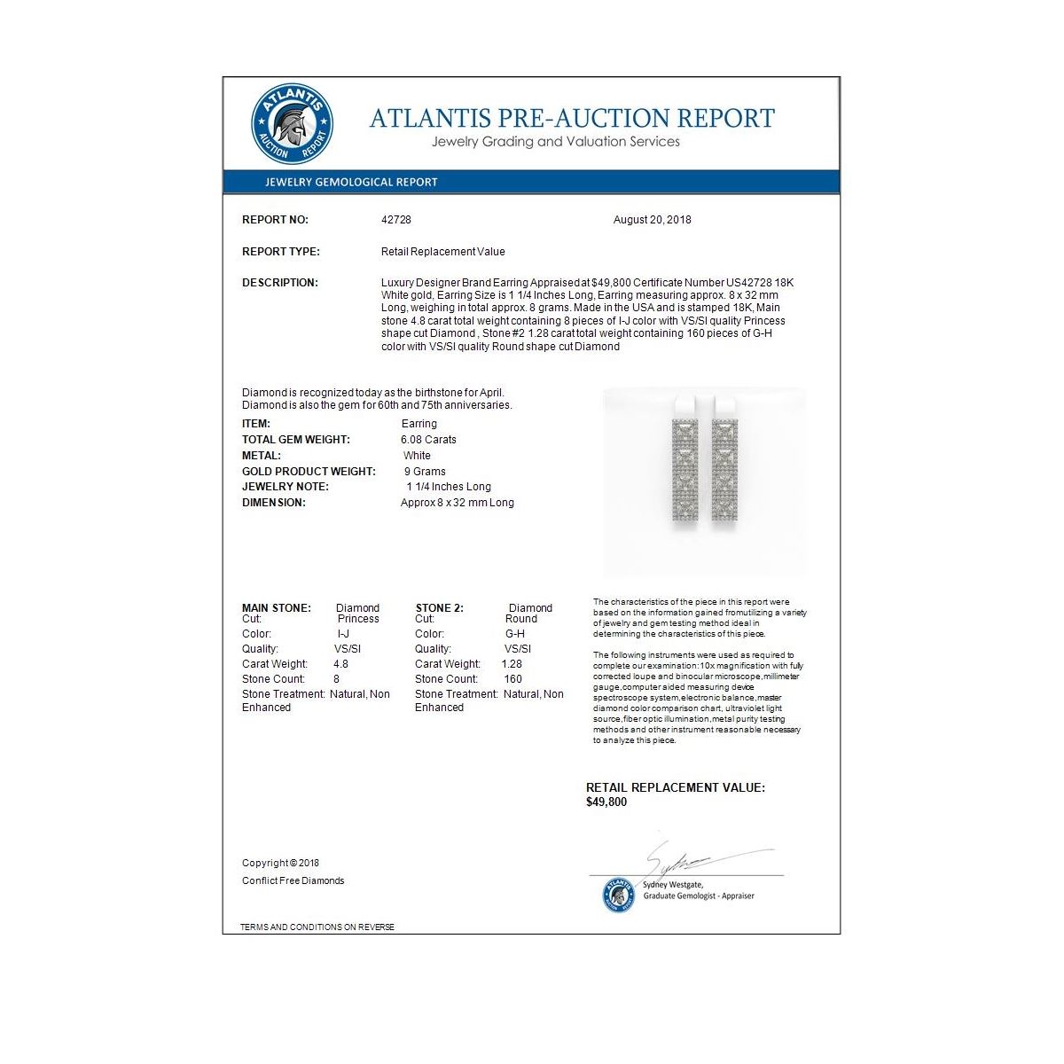 REF-1132H4A -42728 ---- 6.08 CTW Princess Diamond Designer Earrings 18K White Gold ---- Luxury Designer Brand Earring Appraised at $49,800 Certificate Number US42728 18K White gold, Earring Size is 1 1/4 Inches Long, Earring measuring approx. 8 x 32 mm Long, weighing in total approx. 8 grams. Made in the USA and is stamped 18K, Main stone 4.8 carat total weight containing 8 pieces of I-J color with VS/SI quality Princess shape cut Diamond , Stone #2 1.28 carat total weight containing 160 pieces of G-H color with VS/SI quality Round shape cut Diamond