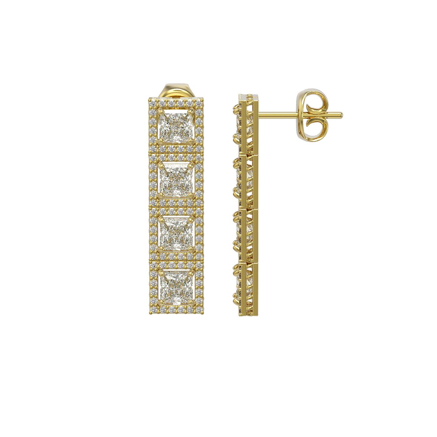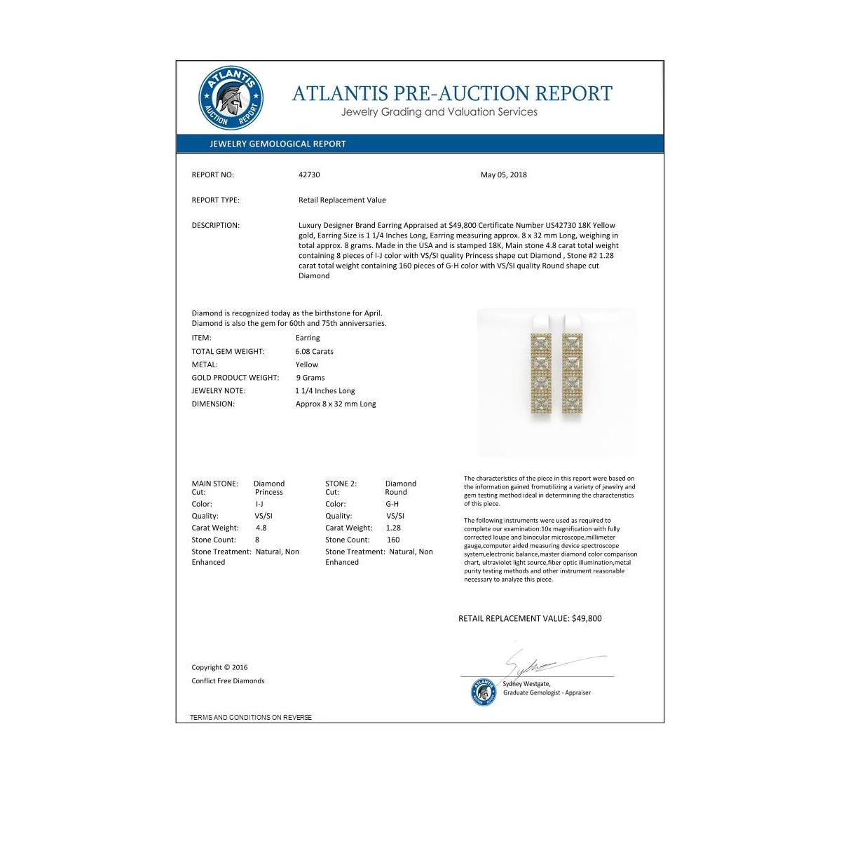 REF-1132T4M -42730 ---- 6.08 CTW Princess Diamond Designer Earrings 18K Yellow Gold ---- Luxury Designer Brand Earring Appraised at $49,800 Certificate Number US42730 18K Yellow gold, Earring Size is 1 1/4 Inches Long, Earring measuring approx. 8 x 32 mm Long, weighing in total approx. 8 grams. Made in the USA and is stamped 18K, Main stone 4.8 carat total weight containing 8 pieces of I-J color with VS/SI quality Princess shape cut Diamond , Stone #2 1.28 carat total weight containing 160 pieces of G-H color with VS/SI quality Round shape cut Diamond