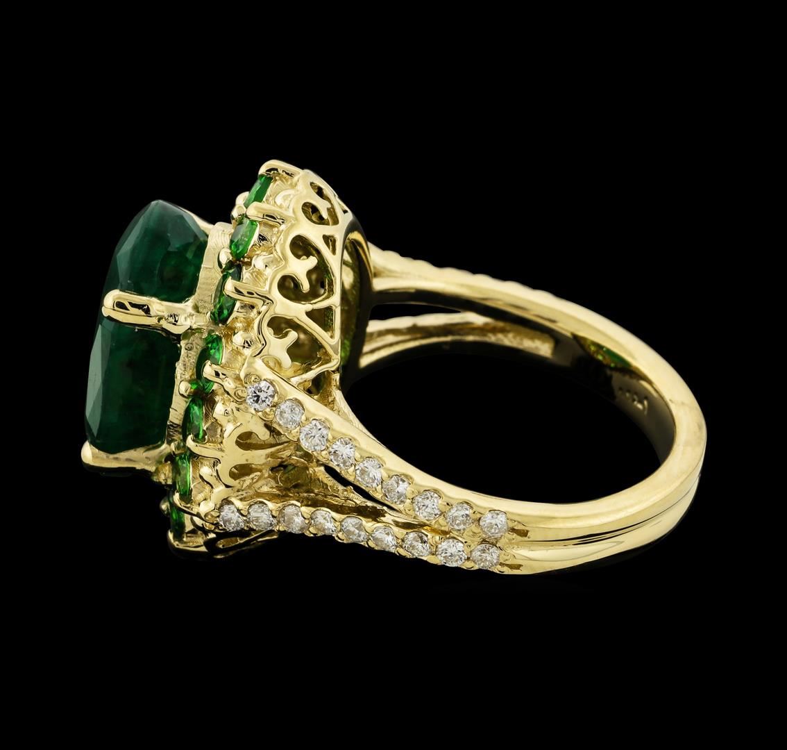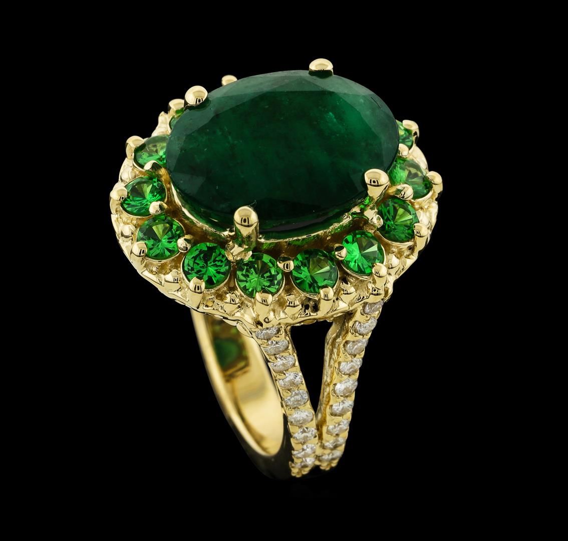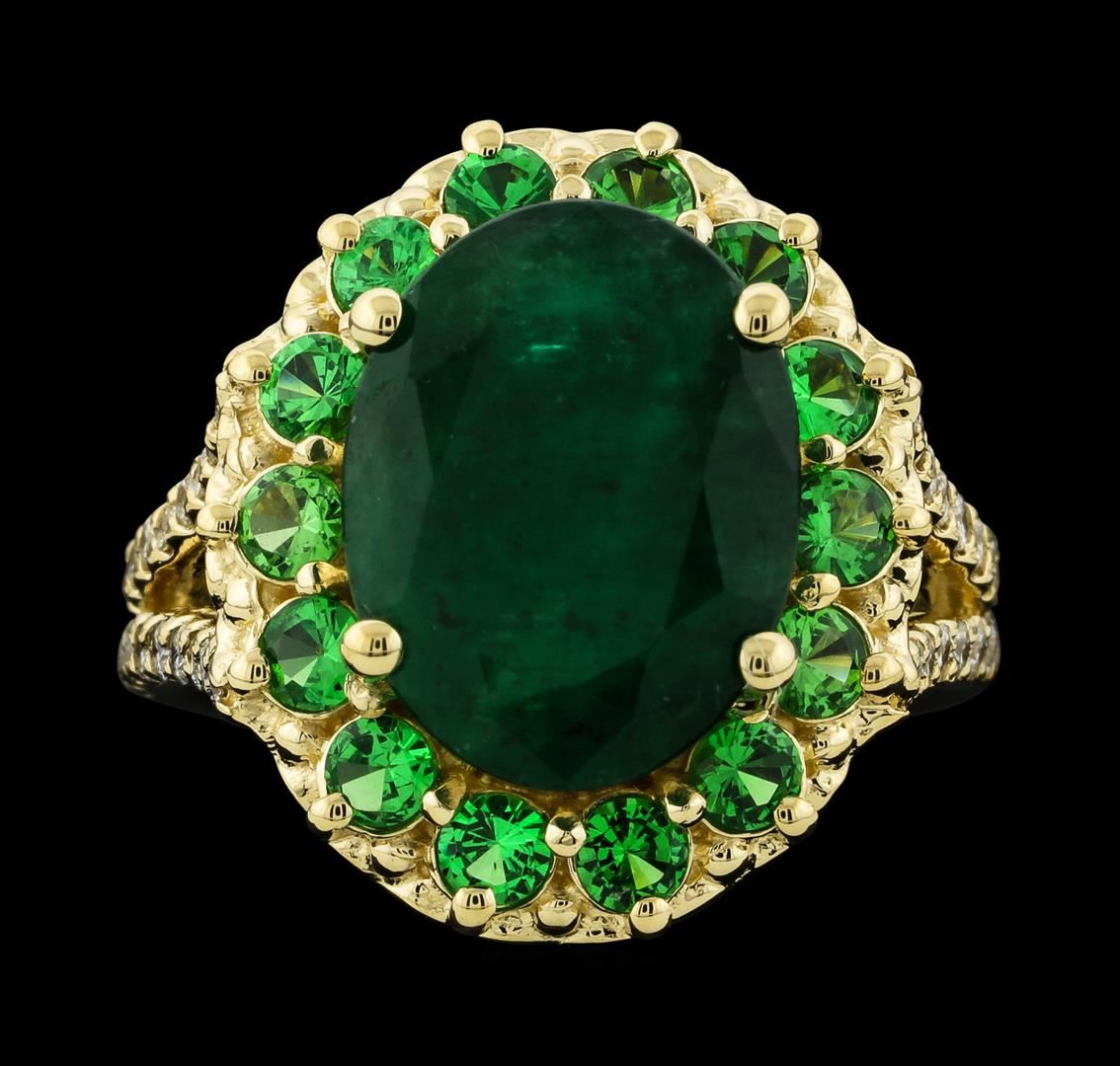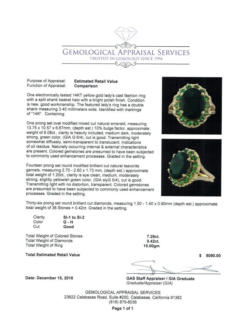 One electronically tested 14KT yellow gold lady's cast fashion ring with a split shank basket halo with a bright polish finish. The featured lady's ring has a double shank measuring 3.40 millimeters wide. Identified with markings of '14K'. Condition is new, good workmanship. Containing: One prong set oval modified mixed cut natural emerald, measuring 13.75 x 10.57 x 6.67mm, (depth est.) 10%. bulge factor, approximate weight of 6.08ct., clarity is heavily included, medium dark, moderately strong, green color, (GIA G 6/4), cut is good. Transmitting light somewhat diffusely, semi-transparent to translucent. Indications of oil residue. Naturally occurring internal & external characteristics are present. Colored gemstones are presumed to have been subjected to commonly used enhancement processes. Graded in the setting. Fourteen prong set round modified brilliant cut natural tsavorite garnets, measuring 2.70 - 2.60 x 1.73 mm, (depth est.) approximate total weight of 1.20ct., clarity is eye clean, medium, moderately strong, slightly yellowish green color, (GIA slyG 5/4), cut is good. Transmitting light with no distortion, transparent. Colored gemstones are presumed to have been subjected to commonly used enhancement processes. Graded in the setting. Thirty-Six prong set round brilliant cut diamonds, measuring 1.50 - 1.40 x 0.90mm (depth est.) approximate total weight of 36 Stones = 0.42ct. Graded in the setting. Clarity SI-1 to SI-2. Color: G - H Cut Good. Total Weight of Colored Stones 7.28ct.. Total Weight of Diamonds 0.42ct.. Total Weight of Ring 10.00gm. GAS Appraised at $8,090.00.