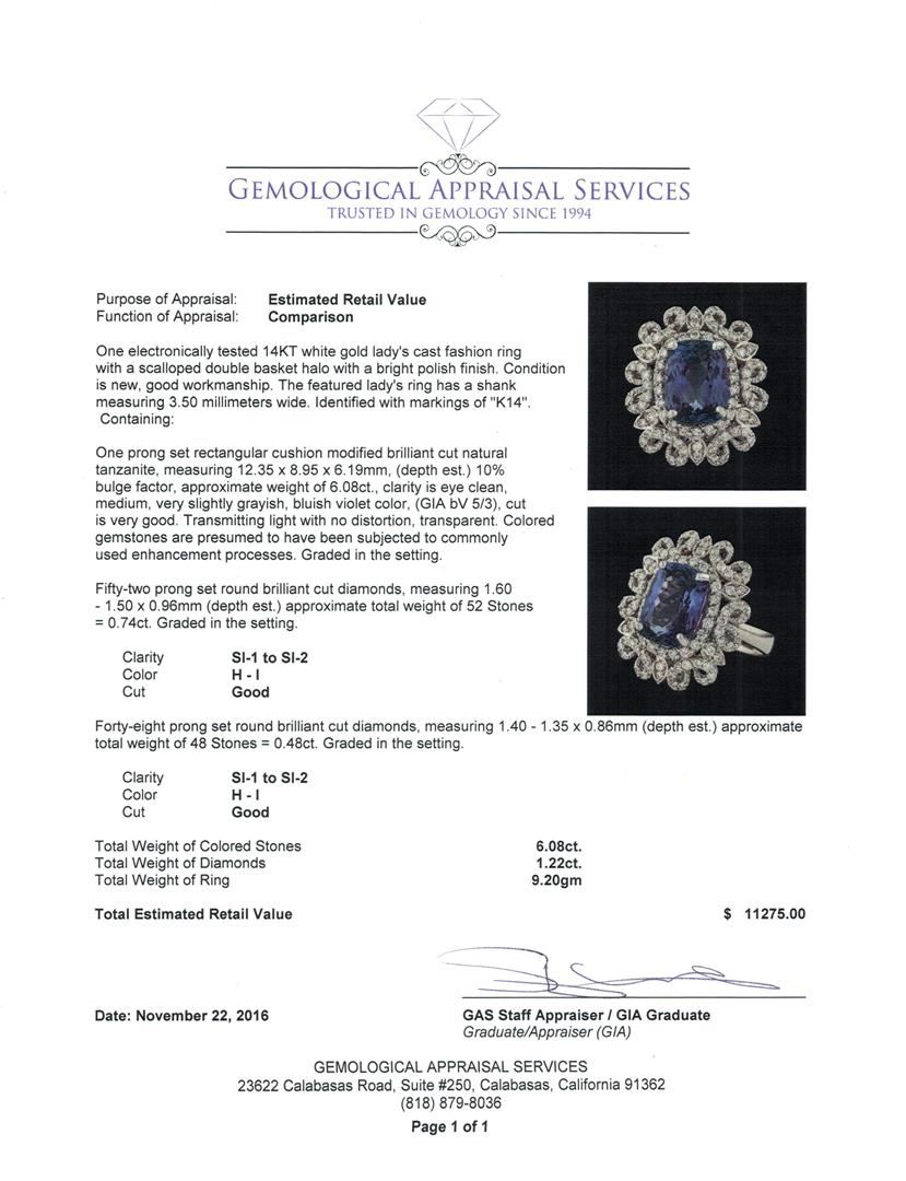One electronically tested 14KT white gold lady's cast fashion ring with a scalloped double basket halo with a bright polish finish. The featured lady's ring has a shank measuring 3.50 millimeters wide. Identified with markings of 'K14'. Condition is new, good workmanship. Containing: One prong set rectangular cushion modified brilliant cut natural tanzanite, measuring 12.35 x 8.95 x 6.19mm, (depth est.) 10%. bulge factor, approximate weight of 6.08ct., clarity is eye clean, medium, very slightly grayish, bluish violet color, (GIA bV 5/3), cut is very good. Transmitting light with no distortion, transparent. Colored gemstones are presumed to have been subjected to commonly used enhancement processes. Graded in the setting. Fifty-Two prong set round brilliant cut diamonds, measuring 1.60 - 1.50 x 0.96mm (depth est.) approximate total weight of 52 Stones = 0.74ct. Graded in the setting. Clarity SI-1 to SI-2. Color: H - I Cut Good Forty-Eight prong set round brilliant cut diamonds, measuring 1.40 - 1.35 x 0.86mm (depth est.) approximate total weight of 48 Stones = 0.48ct. Graded in the setting. Clarity SI-1 to SI-2. Color: H - I Cut Good. Total Weight of Colored Stones 6.08ct.. Total Weight of Diamonds 1.22ct.. Total Weight of Ring 9.20gm. GAS Appraised at $11,275.00.
