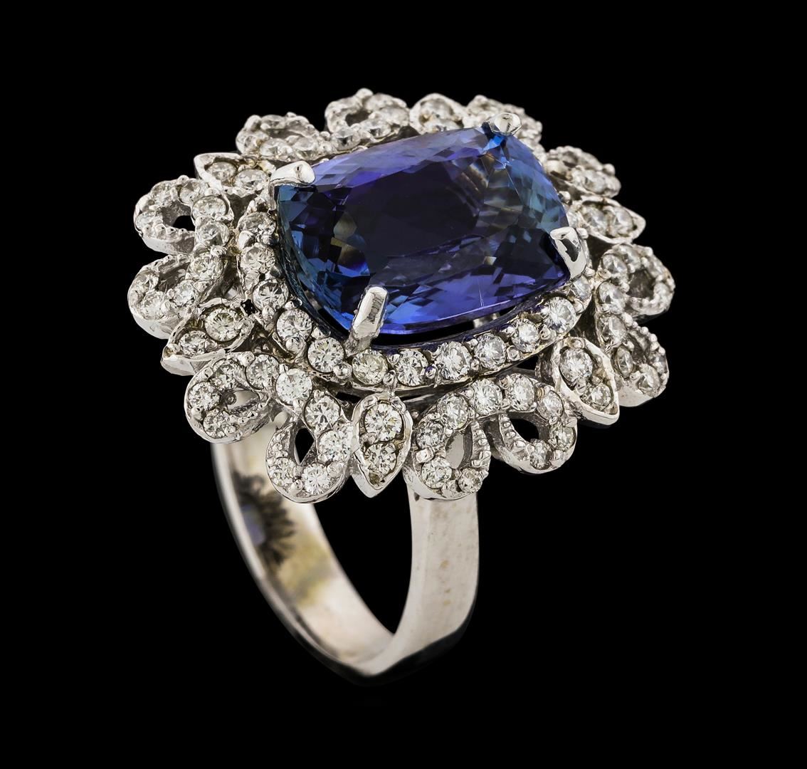 One electronically tested 14KT white gold lady's cast fashion ring with a scalloped double basket halo with a bright polish finish. The featured lady's ring has a shank measuring 3.50 millimeters wide. Identified with markings of 'K14'. Condition is new, good workmanship. Containing: One prong set rectangular cushion modified brilliant cut natural tanzanite, measuring 12.35 x 8.95 x 6.19mm, (depth est.) 10%. bulge factor, approximate weight of 6.08ct., clarity is eye clean, medium, very slightly grayish, bluish violet color, (GIA bV 5/3), cut is very good. Transmitting light with no distortion, transparent. Colored gemstones are presumed to have been subjected to commonly used enhancement processes. Graded in the setting. Fifty-Two prong set round brilliant cut diamonds, measuring 1.60 - 1.50 x 0.96mm (depth est.) approximate total weight of 52 Stones = 0.74ct. Graded in the setting. Clarity SI-1 to SI-2. Color: H - I Cut Good Forty-Eight prong set round brilliant cut diamonds, measuring 1.40 - 1.35 x 0.86mm (depth est.) approximate total weight of 48 Stones = 0.48ct. Graded in the setting. Clarity SI-1 to SI-2. Color: H - I Cut Good. Total Weight of Colored Stones 6.08ct.. Total Weight of Diamonds 1.22ct.. Total Weight of Ring 9.20gm. GAS Appraised at $11,275.00.