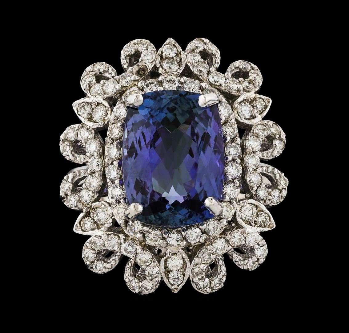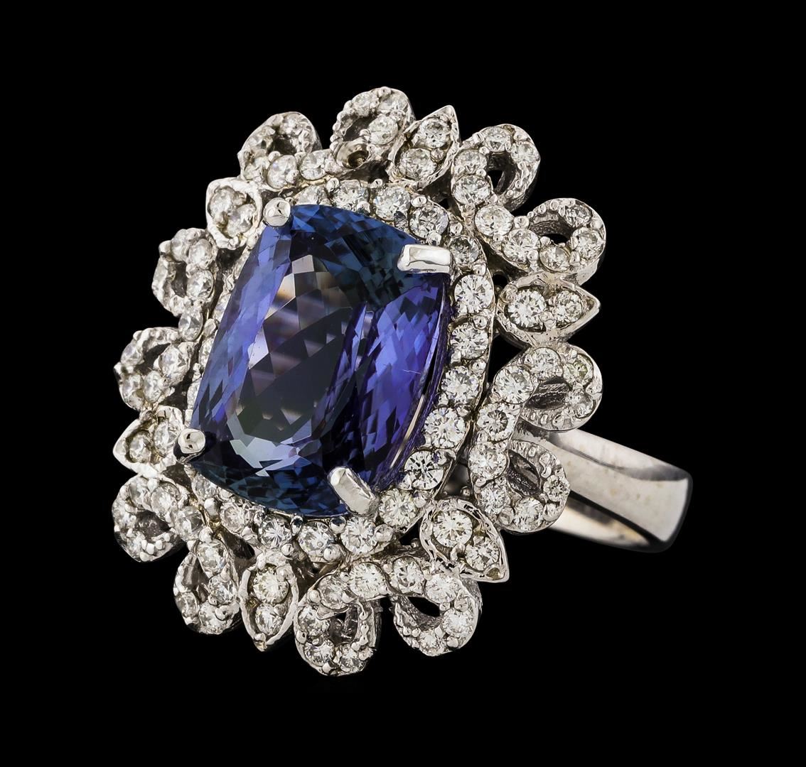 One electronically tested 14KT white gold lady's cast fashion ring with a scalloped double basket halo with a bright polish finish. The featured lady's ring has a shank measuring 3.50 millimeters wide. Identified with markings of 'K14'. Condition is new, good workmanship. Containing: One prong set rectangular cushion modified brilliant cut natural tanzanite, measuring 12.35 x 8.95 x 6.19mm, (depth est.) 10%. bulge factor, approximate weight of 6.08ct., clarity is eye clean, medium, very slightly grayish, bluish violet color, (GIA bV 5/3), cut is very good. Transmitting light with no distortion, transparent. Colored gemstones are presumed to have been subjected to commonly used enhancement processes. Graded in the setting. Fifty-Two prong set round brilliant cut diamonds, measuring 1.60 - 1.50 x 0.96mm (depth est.) approximate total weight of 52 Stones = 0.74ct. Graded in the setting. Clarity SI-1 to SI-2. Color: H - I Cut Good Forty-Eight prong set round brilliant cut diamonds, measuring 1.40 - 1.35 x 0.86mm (depth est.) approximate total weight of 48 Stones = 0.48ct. Graded in the setting. Clarity SI-1 to SI-2. Color: H - I Cut Good. Total Weight of Colored Stones 6.08ct.. Total Weight of Diamonds 1.22ct.. Total Weight of Ring 9.20gm. GAS Appraised at $11,275.00.