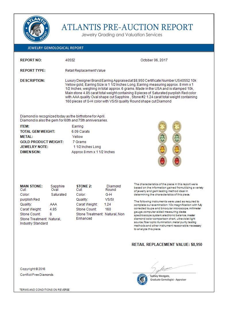 40552 - REF-135W3H ---- 6.09 CTW Multi Color Sapphire & Diamond Earrings 10K Yellow Gold ---- Luxury Designer Brand Earring Appraised at $8,950 Certificate Number US40552 10k Yellow gold, Earring Size is 1 1/2 Inches Long, Earring measuring approx. 8 mm x 1 1/2 Inches, weighing in total approx. 6 grams. Made in the USA and is stamped 10k, Main stone 4.85 carat total weight containing 8 pieces of Saturated purplish Red color with AAA quality Oval shape cut Sapphire , Stone #2 1.24 carat total weight containing 160 pieces of G-H color with VS/SI quality Round shape cut Diamond