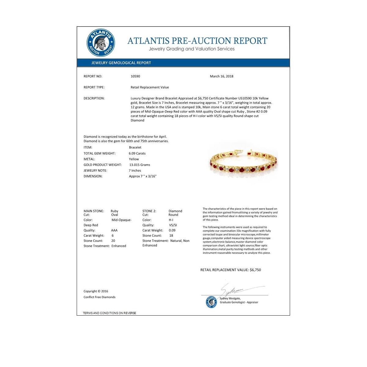REF-94A5X -10590 ---- 6.09 CTW Ruby & Diamond Bracelet 10K Yellow Gold ---- Luxury Designer Brand Bracelet Appraised at $6,750 Certificate Number US10590 10k Yellow gold, Bracelet Size is 7 Inches, Bracelet measuring approx. 7 " x 3/16", weighing in total approx. 12 grams. Made in the USA and is stamped 10k, Main stone 6 carat total weight containing 20 pieces of Mid-Opaque-Deep Red color with AAA quality Oval shape cut Ruby , Stone #2 0.09 carat total weight containing 18 pieces of H-I color with VS/SI quality Round shape cut Diamond