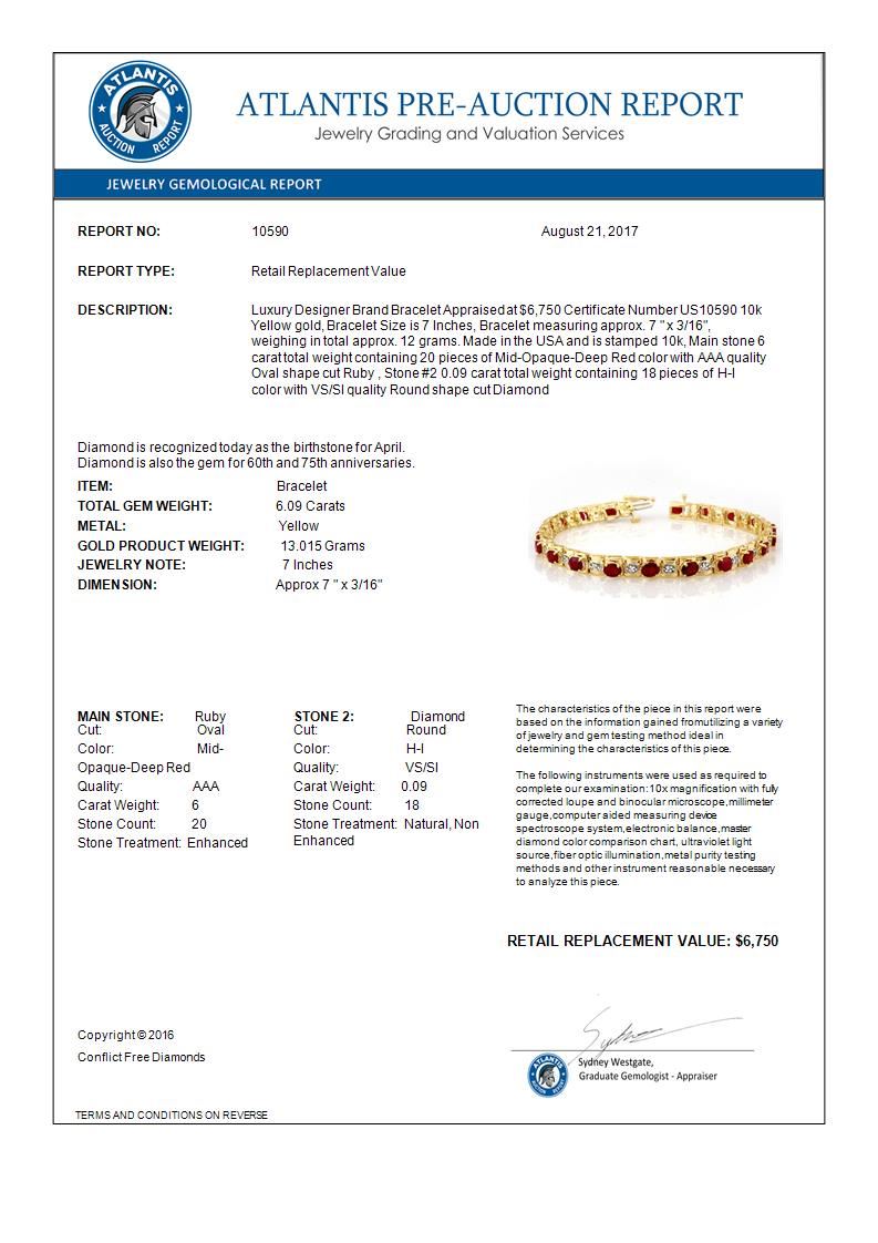 10590 - REF-94F5N ---- 6.09 CTW Ruby & Diamond Bracelet 10K Yellow Gold ---- Luxury Designer Brand Bracelet Appraised at $6,750 Certificate Number US10590 10k Yellow gold, Bracelet Size is 7 Inches, Bracelet measuring approx. 7 " x 3/16", weighing in total approx. 12 grams. Made in the USA and is stamped 10k, Main stone 6 carat total weight containing 20 pieces of Mid-Opaque-Deep Red color with AAA quality Oval shape cut Ruby , Stone #2 0.09 carat total weight containing 18 pieces of H-I color with VS/SI quality Round shape cut Diamond