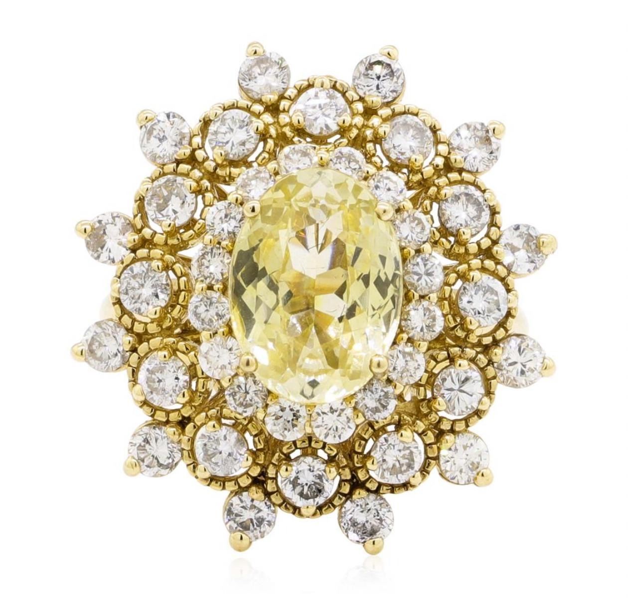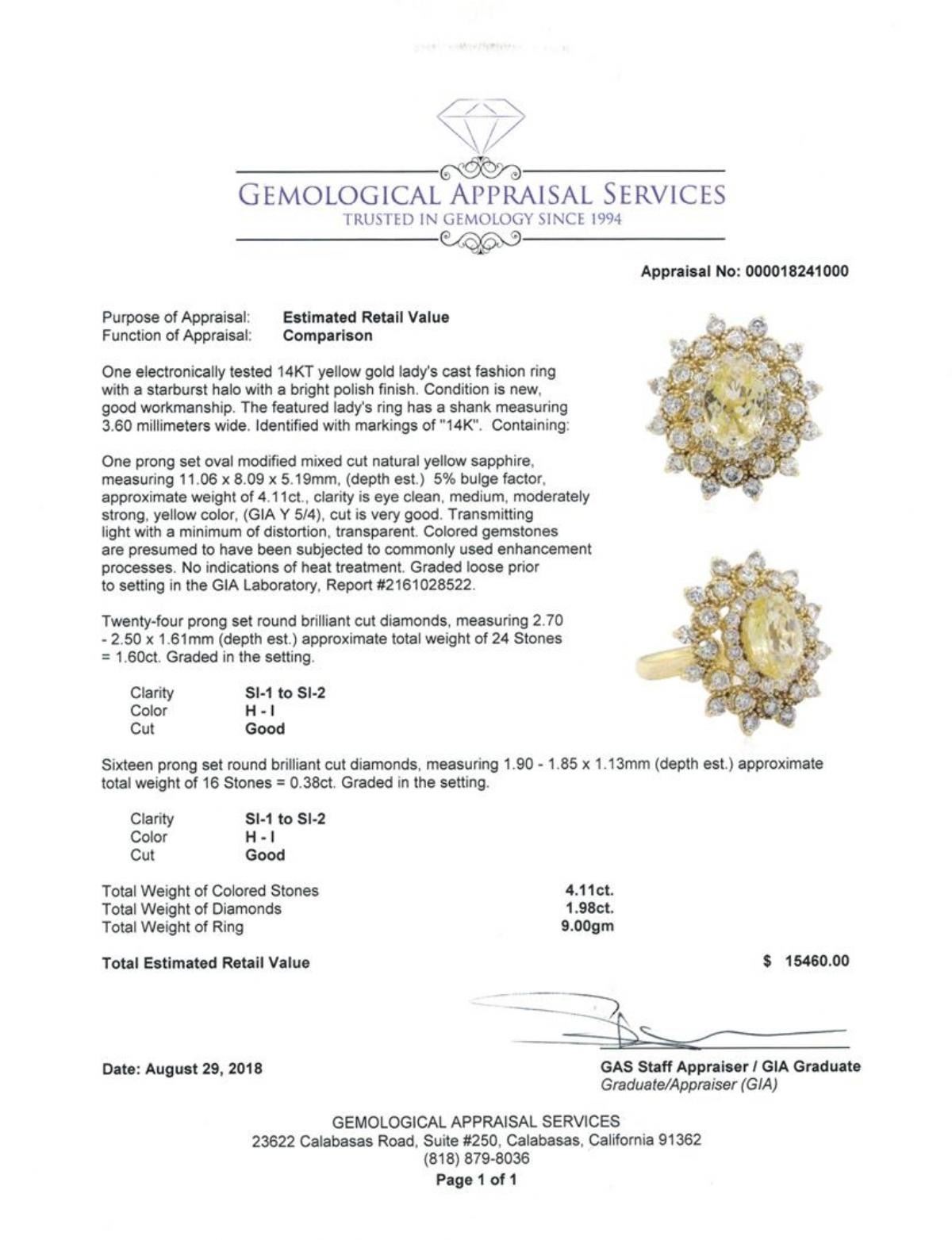 One electronically tested 14KT yellow gold lady's cast fashion ring with a starburst halo with a bright polish finish. The featured lady's ring has a shank measuring 3.60 millimeters wide. Identified with markings of '14K'. Condition is new, good workmanship. Containing: One prong set oval modified mixed cut natural yellow sapphire, measuring 11.06 x 8.09 x 5.19mm, (depth est.) 5%. bulge factor, approximate weight of 4.11ct., clarity is eye clean, medium, moderately strong, yellow color, (GIA Y 5/4), cut is very good. Transmitting light with a minimum of distortion, transparent. Colored gemstones are presumed to have been subjected to commonly used enhancement processes. No indications of heat treatment. Graded loose prior to setting in the GIA Laboratory, Report #2161028522. Twenty-Four prong set round brilliant cut diamonds, measuring 2.70 - 2.50 x 1.61mm (depth est.) approximate total weight of 24 Stones = 1.60ct. Graded in the setting. Color H - I Clarity SI-1 to SI-2 Cut Good Sixteen prong set round brilliant cut diamonds, measuring 1.90 - 1.85 x 1.13mm (depth est.) approximate total weight of 16 Stones = 0.38ct. Graded in the setting. Color H - I Clarity SI-1 to SI-2 Cut Good. Total Weight of Colored Stones 4.11ct.. Total Weight of Diamonds 1.98ct.. Total Weight of Ring 9.00gm GAS Appraised at $15460.00. GAS Appraised.