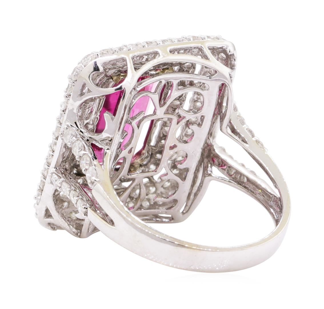 One electronically tested 14KT white gold lady's combination cast & assembled fashion ring with a split shank double basket halo with a bright polish finish. The featured lady's ring has a shank measuring 2.86 millimeters wide. Identified with markings of '14K'. Condition is new, good workmanship. Containing: One prong set emerald standard step cut natural pink tourmaline, measuring 13.53 x 7.58 x 3.98mm, (depth est.) 10%. bulge factor, approximate weight of 3.71ct., clarity is slightly included, medium, very slightly brownish, slightly purplish red color, (GIA slpR 5/3), cut is very good. Transmitting light with a minimum of distortion, transparent. Colored gemstones are presumed to have been subjected to commonly used enhancement processes. Graded in the setting. One Hundred Twenty-Two prong set round brilliant cut diamonds, measuring 1.80 - 1.70 x 1.05mm (depth est.) approximate total weight of 122 Stones = 2.38ct. Graded in the setting. Color I - J Clarity SI-2 to I-2 Cut Good. Total Weight of Colored Stones 3.71ct.. Total Weight of Diamonds 2.38ct.. Total Weight of Ring 7.10gm GAS Appraised at $6220.00.
