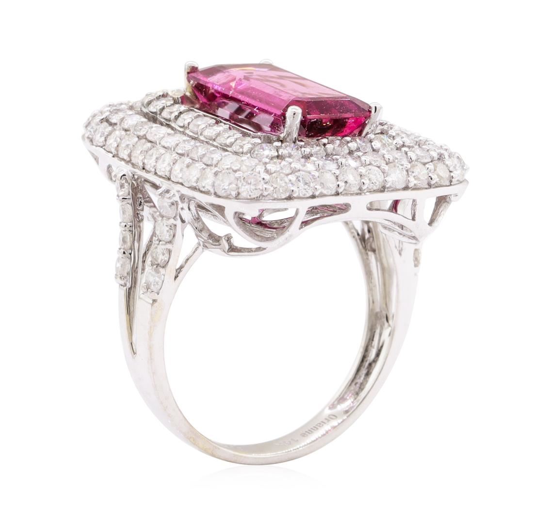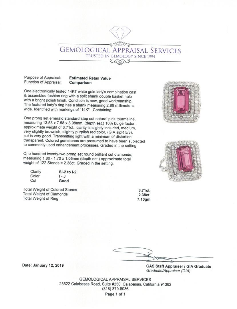 One electronically tested 14KT white gold lady's combination cast & assembled fashion ring with a split shank double basket halo with a bright polish finish. The featured lady's ring has a shank measuring 2.86 millimeters wide. Identified with markings of '14K'. Condition is new, good workmanship. Containing: One prong set emerald standard step cut natural pink tourmaline, measuring 13.53 x 7.58 x 3.98mm, (depth est.) 10%. bulge factor, approximate weight of 3.71ct., clarity is slightly included, medium, very slightly brownish, slightly purplish red color, (GIA slpR 5/3), cut is very good. Transmitting light with a minimum of distortion, transparent. Colored gemstones are presumed to have been subjected to commonly used enhancement processes. Graded in the setting. One Hundred Twenty-Two prong set round brilliant cut diamonds, measuring 1.80 - 1.70 x 1.05mm (depth est.) approximate total weight of 122 Stones = 2.38ct. Graded in the setting. Color I - J Clarity SI-2 to I-2 Cut Good. Total Weight of Colored Stones 3.71ct.. Total Weight of Diamonds 2.38ct.. Total Weight of Ring 7.10gm GAS Appraised at $6220.00.