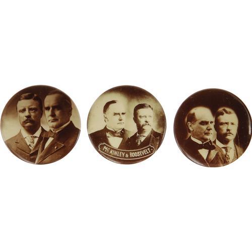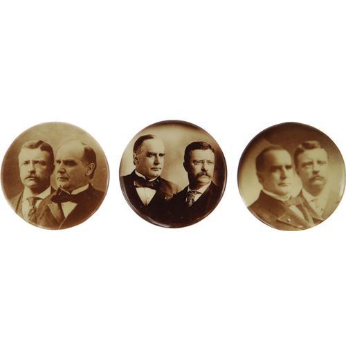 <B>Six 1 1/4" Sepia McKinley & Roosevelt Jugate Buttons, Including Four Highly Unusual Varieties.</B></I> We thought the four conjoined-bust varieties simply played off each other too nicely to separate them! All six in beautiful condition. <I>From the Norman Loewenstern Collection.</B></I>