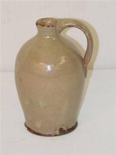 6 1/2" EARLY MAINE REDWARE SMALL HANDLED JUG W/ GREAT LIGHT GREY GLAZE - SMALL CHIP ON BASE & GLAZE WEAR TO TOP LIP;