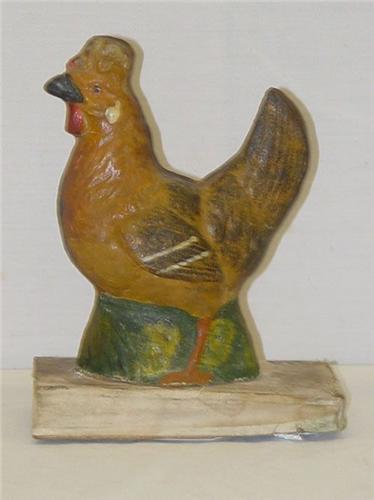 6 1/2" EARLY PAINTED PAPIER MACHE ROOSTER SQUEAK TOY - NICE PAINT, SQUEAKER NOT WORKING, IMPERFECTIONS