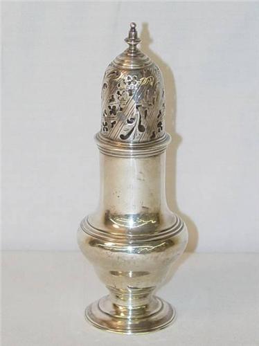 6 1/2" ENGLISH SILVER SUGAR CASTOR - 1763 R. PEASTON - WEAR and SMALL DENTS;