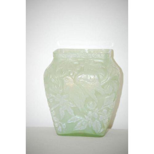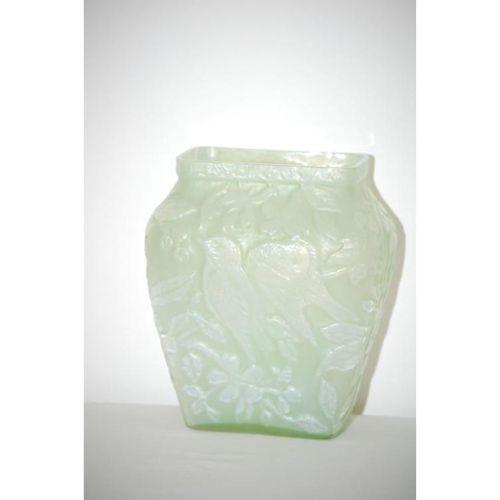 6 1/2" GREEN PHOENIX ART GLASS VASE W/ EMBOSSED DECORATION OF SONGBIRDS ON FLOWERING BRANCHES-LIGHT OPALESCENT GREEN, UNMARKED - MINOR WEAR & IMPERFECTIONS