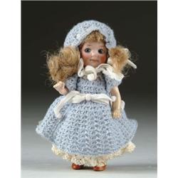 6 1/2” HERM STEINER GOOGLEY. An unusual googley with a smile, side glancing eyes, and gently arched eyebrows. On a five-piece chubby composition body with molded shoes and socks, this little pixie is adorable! She is wearing a baby blue crocheted dress with matching bonnet and a newer sandy blonde human hair wig. SIZE: 6 1/2”. CONDITION: Overall very fine, small blemish/pimple to nose. JL 1-4627 (450-650)