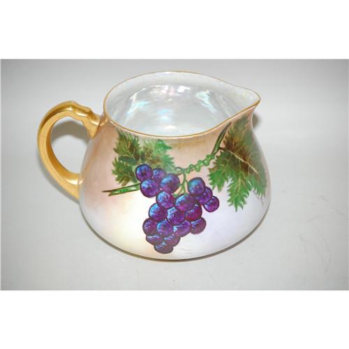 LIMOGES HAND PAINTED CIDER PITCHER - 6 1/2" BULBOUS FORM HAND DECORATED CIDER PITCHER W/ GRAPEVINES & GRAPE CLUSTER DECORATION-SIGNED SOPHORA P. ROSS W/ GREEN LIMOGES STAMP ON BASE - GOLD WEAR & IMPERFECTIONS;