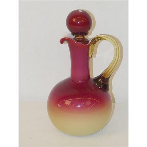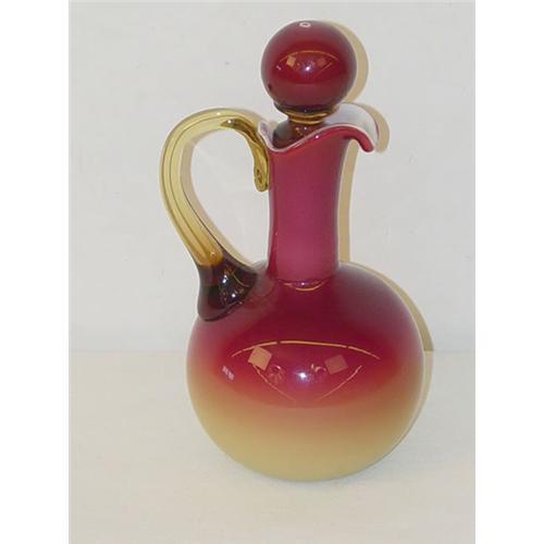 6 1/2" PEACHBLOW ART GLASS CRUET W/ ORIGINAL STOPPER-GLOSSY FINISH & APPLIED AMBER HANDLE W/ POLISHED BOTTOM - MINOR WEAR