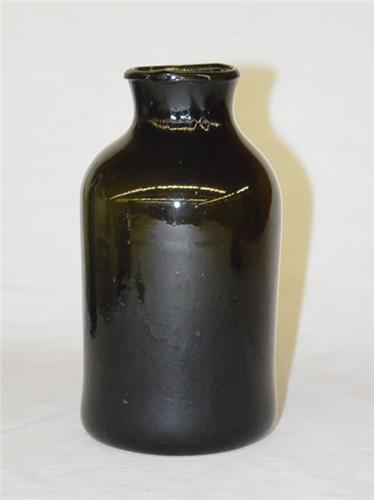 6 1/4" CYLINDER UTILITY BOTTLE-OLIVE GREEN W/ ROLLED LIP & IMPROVED PONTIL (6 1/4" H X 3 3/8" D)