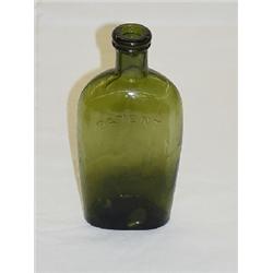 6 1/4" GREEN SEAM SIDE 1/2 PINT FLASK - PATENT ON SHOULDER - SMOOTH BASE W/ APPLIED TOP