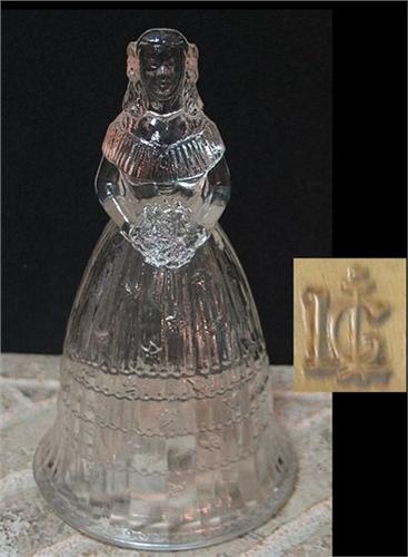6 1/4" tall bell in the likeness of a Bride. Marked on lower back rim "LG" possibly made by Liberty Glass
