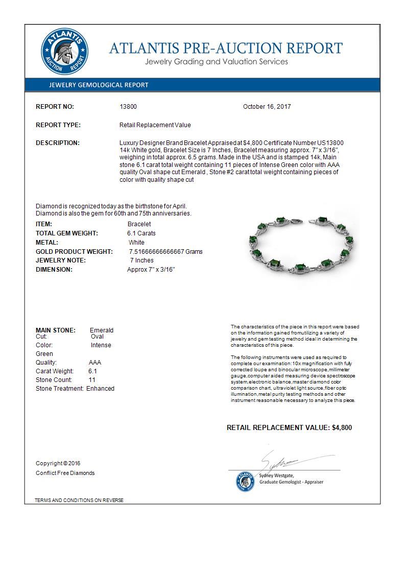 REF-72A8X -13800 ---- 6.10 CTW Emerald Bracelet 14K White Gold ---- Luxury Designer Brand Bracelet Appraised at $4,800 Certificate Number US13800 14k White gold, Bracelet Size is 7 Inches, Bracelet measuring approx. 7" x 3/16", weighing in total approx. 6.5 grams. Made in the USA and is stamped 14k, Main stone 6.1 carat total weight containing 11 pieces of Intense Green color with AAA quality Oval shape cut Emerald , Stone #2 carat total weight containing pieces of color with quality shape cut