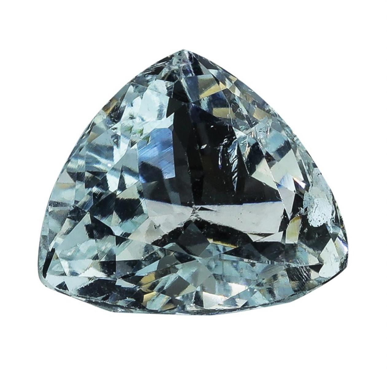 One natural trilliant cut aquamarine with an exact weight of 6.10ct., clarity is slightly included, slightly grayish greenish blue, light. Gemological Appraisals Services estimates the retail value at $2348.5 GAS Appraised.