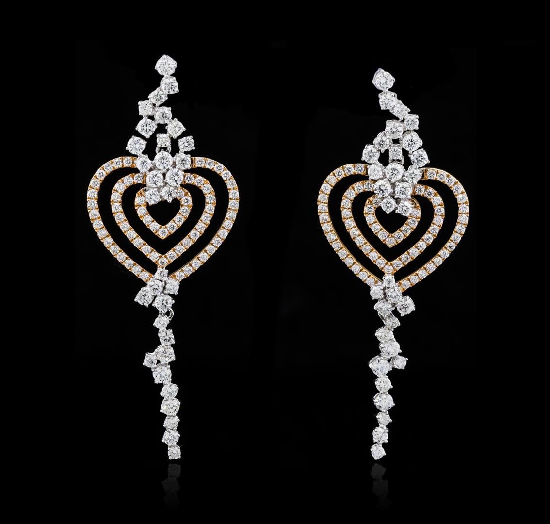One pair electronically tested 18KT rose and white gold lady's combination cast & assembled heart shape dangle earrings with medium friction backs with a bright polish finish. The featured lady's dangle earrings measure 64 millimeters in length. Identified with markings of "18K 750". Condition is new, good workmanship. Containing: Sixty-Four prong set round brilliant cut diamonds, measuring 2.70 - 2.10 x 1.49mm (depth est.) approximate total weight of 64 Stones = 3.35ct. Graded in the setting. Clarity: SI-1 to SI-2. Color: H - I. Cut Good One Hundred Ninety-Four prong set round brilliant cut diamonds, measuring 1.60 - 1.50 x 0.96mm (depth est.) approximate total weight of 194 Stones = 2.75ct. Graded in the setting. Clarity: VS-2 to SI-1. Color: G - I. Cut Very Good. Total Weight of Diamonds 6.10ct. Total Weight of Earrings 13.80gm. GAS Appraised at $18,580.00.