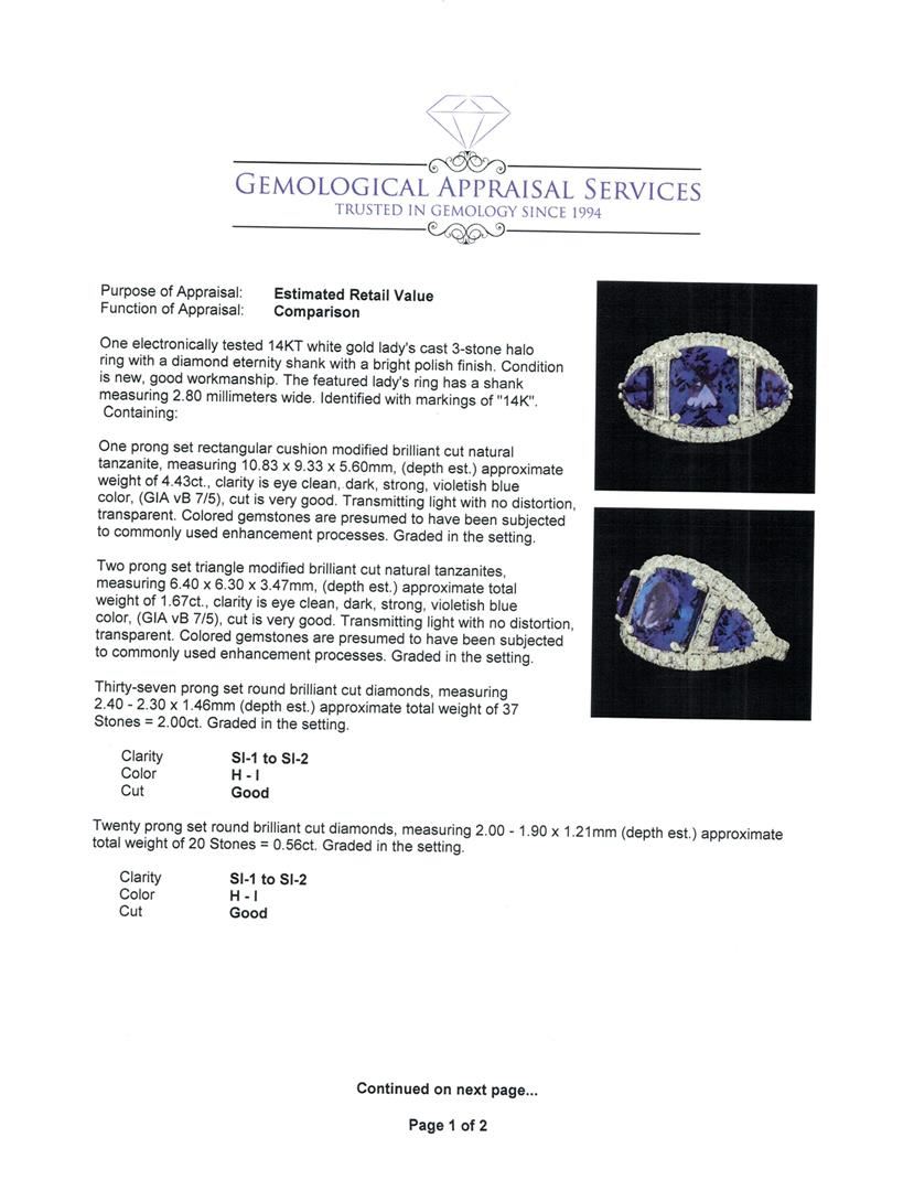 One electronically tested 14KT white gold lady's cast 3-stone halo ring with a diamond eternity shank with a bright polish finish. The featured lady's ring has a shank measuring 2.80 millimeters wide. Identified with markings of '14K'. Condition is new, good workmanship. Containing: One prong set rectangular cushion modified brilliant cut natural tanzanite, measuring 10.83 x 9.33 x 5.60mm, (depth est.) approximate weight of 4.43ct., clarity is eye clean, dark, strong, violetish blue color, (GIA vB 7/5), cut is very good. Transmitting light with no distortion, transparent. Colored gemstones are presumed to have been subjected to commonly used enhancement processes. Graded in the setting. Two prong set triangle modified brilliant cut natural tanzanites, measuring 6.40 x 6.30 x 3.47mm, (depth est.) approximate total weight of 1.67ct., clarity is eye clean, dark, strong, violetish blue color, (GIA vB 7/5), cut is very good. Transmitting light with no distortion, transparent. Colored gemstones are presumed to have been subjected to commonly used enhancement processes. Graded in the setting. Thirty-Seven prong set round brilliant cut diamonds, measuring 2.40 - 2.30 x 1.46mm (depth est.) approximate total weight of 37 Stones = 2.00ct. Graded in the setting. Clarity SI-1 to SI-2. Color: H - I Cut Good Twenty prong set round brilliant cut diamonds, measuring 2.00 - 1.90 x 1.21mm (depth est.) approximate total weight of 20 Stones = 0.56ct. Graded in the setting. Clarity SI-1 to SI-2. Color: H - I Cut Good. Total Weight of Colored Stones 6.10ct.. Total Weight of Diamonds 2.56ct.. Total Weight of Ring 10.70gm. GAS Appraised at $17,725.00.