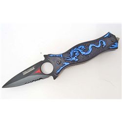 Red skull and pipe on handle. 5" closed. Features half serrated, black stainless steel blade. Includes seat belt cutter, glass breaker and pock...