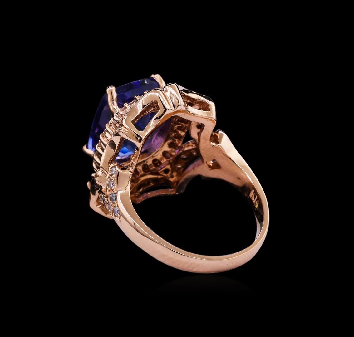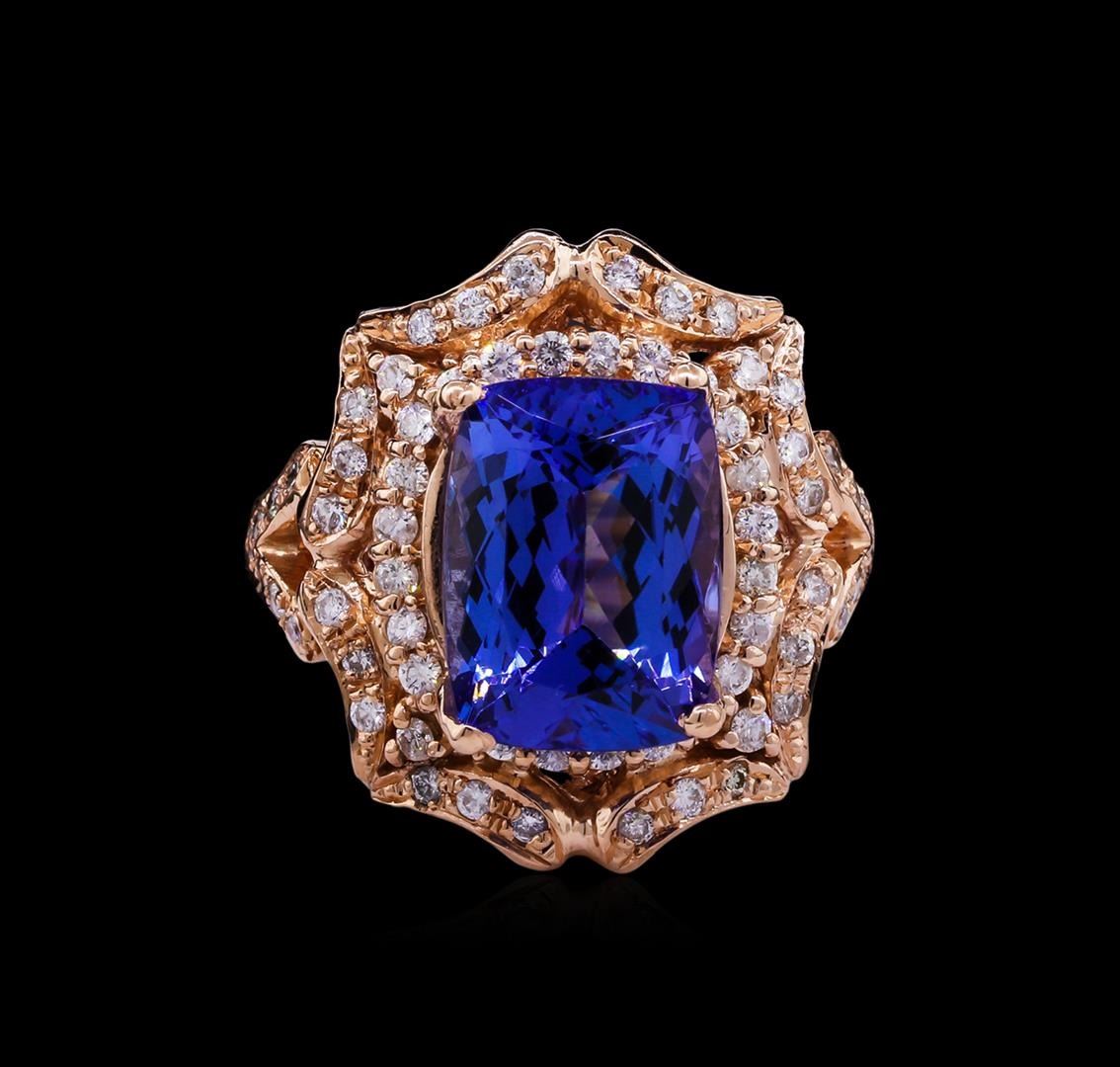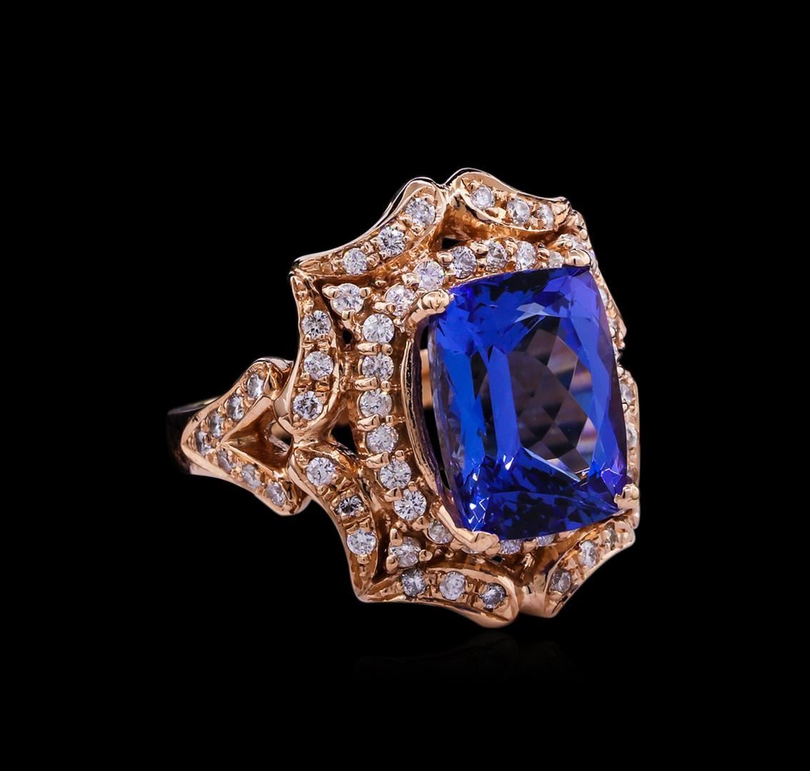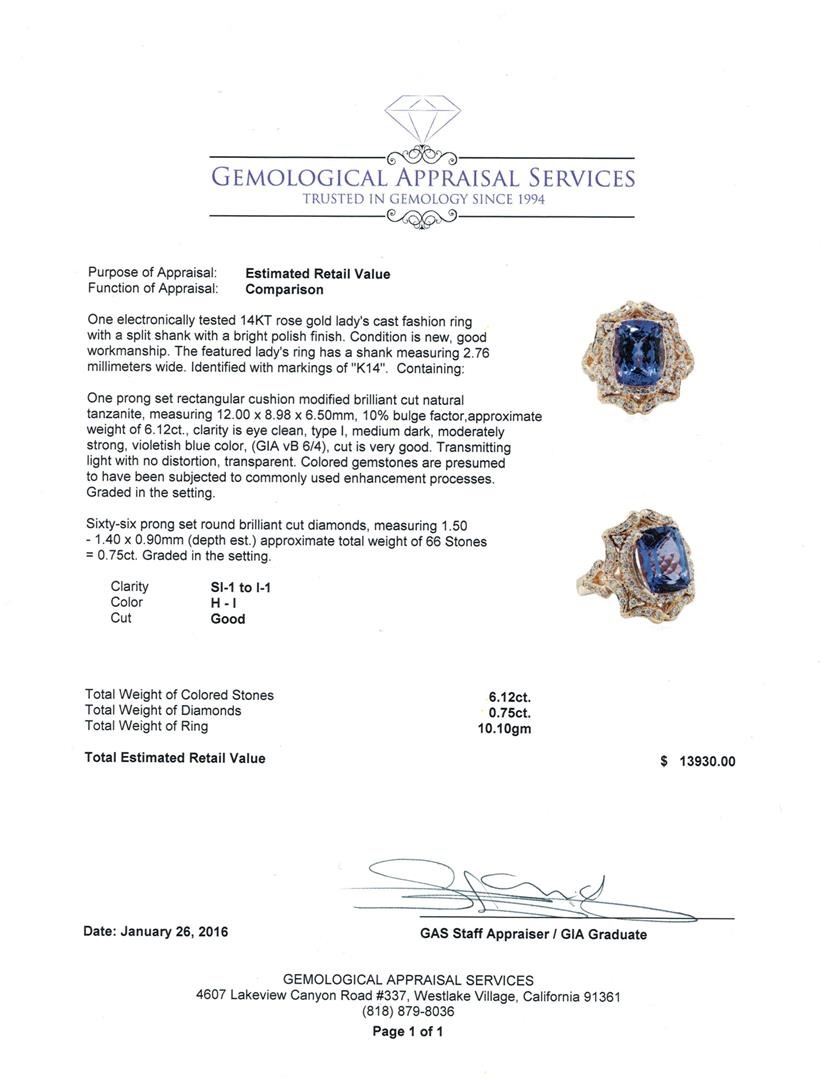 One electronically tested 14KT rose gold lady's cast fashion ring with a split shank with a bright polish finish. The featured lady's ring has a shank measuring 2.76 millimeters wide. Identified with markings of "K14". Condition is new, good workmanship. Containing: One prong set rectangular cushion modified brilliant cut natural tanzanite, measuring 12.00 x 8.98 x 6.50mm, 10%. bulge factor, approximate weight of 6.12ct., clarity is eye clean, type I, medium dark, moderately strong, violetish blue color, (GIA vB 6/4), cut is very good. Transmitting light with no distortion, transparent. Colored gemstones are presumed to have been subjected to commonly used enhancement processes. Graded in the setting. Sixty-Six prong set round brilliant cut diamonds, measuring 1.50 - 1.40 x 0.90mm (depth est.) approximate total weight of 66 Stones = 0.75ct. Graded in the setting. Clarity: SI-1 to I-1. Color: H - I. Cut Good. Total Weight of Colored Stones 6.12ct. Total Weight of Diamonds 0.75ct. Total Weight of Ring 10.10gm. GAS Appraised at $13,930.00.